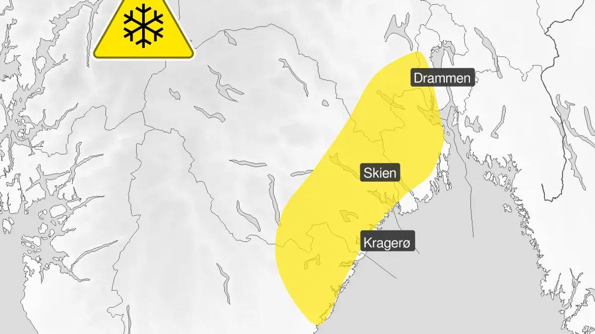 Det gule farevarselet gjelder hovedsakelig fra Drammen til Arendal, og det omfatter deler av Buskerud, Vestfold, Telemark og Agder.