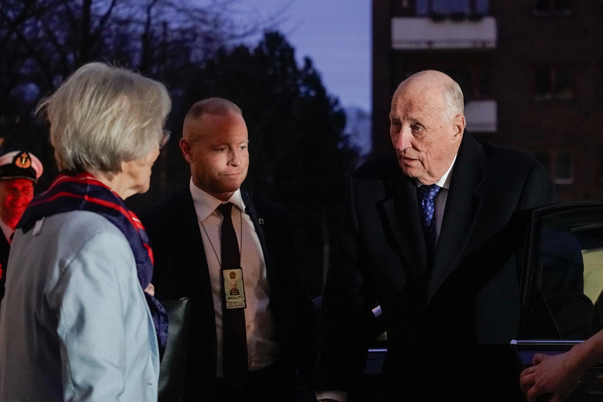 Kong Harald svarte ikke på spørsmål om kronprinsessen på vei inn til å møte norske idrettsleder-veteraner i Oslo tirsdag.