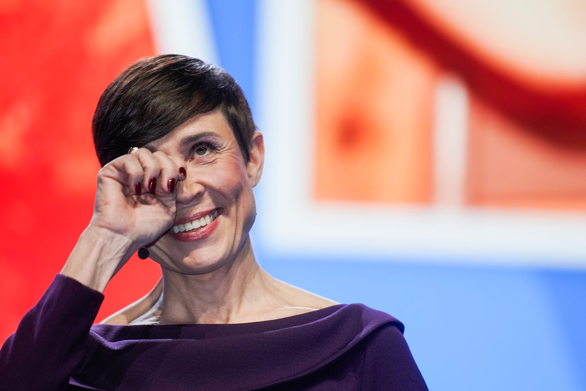 – Mammaen min Wenche var sekretær, og pappa Egil var elektriker. Begge døde altfor tidlig i sitt liv og i mitt liv. Men jeg tror og håper at de hadde vært litt stolte hvis de hadde vært her i dag, sier Søreide med skjelven stemme, til kraftig applaus fra salen, og tørker en tåre.