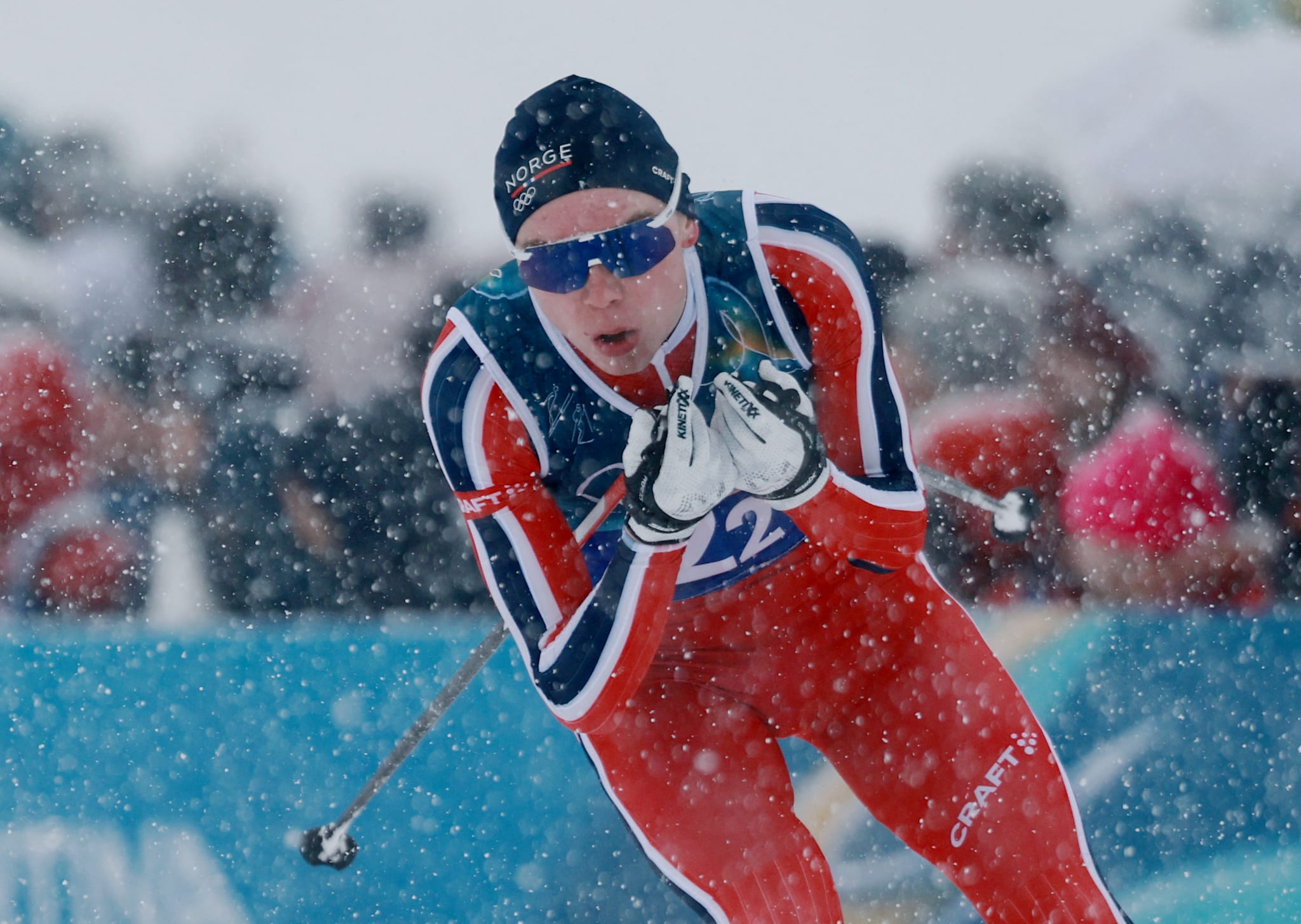 I langrennsdelen lavet snøen ned og forholdene var blytunge. Likevel spiste Norge raskt opp forspranget til den tyske duoen Johannes Rydzek og Vinzenz Geiger, som ledet etter hoppingen.