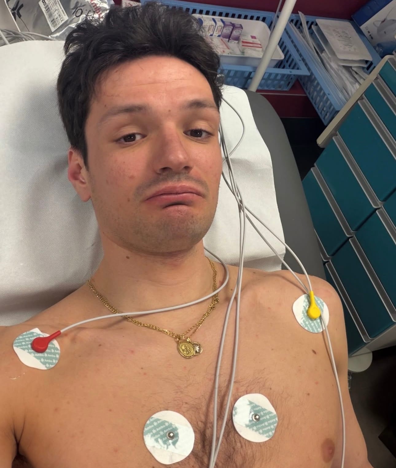 Giacomel pekte mot eget bryst og signaliserte at noe var galt. Senere fredag delte utøveren selv et innlegg på Instagram fra sykesengen.