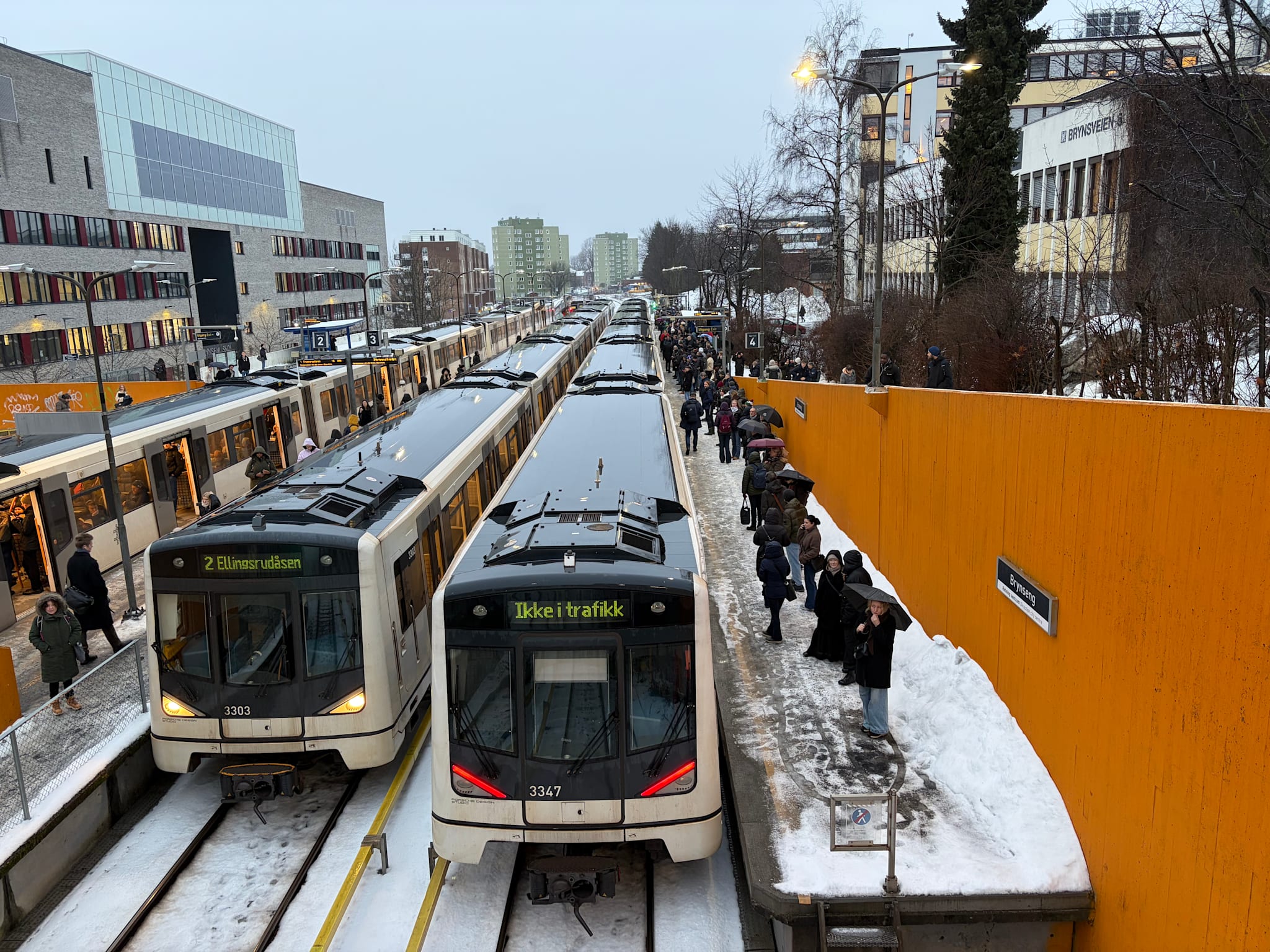 </div><div class="hyperion-css-c9g7d0" id="main" role="main"><div class="hyperion-css-roozon"><div class="advertory-aftenposten-skyscraperleft_1-wrapper"><div class="advertory-aftenposten-skyscraperleft_1" id="skyscraperleft_1"></div></div></div><div class="hyperion-css-yck6b5"><div class="page-layout-supertop hyperion-css-1499hb2"><div class="advertory-aftenposten-topboard-wrapper"><div class="advertory-aftenposten-topboard" id="topboard" style="min-height:150px"></div></div><div class="advertory-wrapper-common-wallpaper wallpaper"><div class="advertory-common-wallpaper disable-cogwheel" id="wallpaper"></div></div></div><div class="hyperion-css-dz5hzo"><article class="article-wrapper-6q941o"><div class="hyperion-css-vjh7xz"><p class="hyperion-css-181zwpd">Akkurat nå</p></div><h1 class="extendedContent h1 hyperion-css-11xvwpf" data-test-tag="headline">Store forsinkelser på T-banen: Feilen er rettet opp</h1><p class="extendedContent hyperion-css-eyn926" data-test-tag="lead-text">Signalfeilen som førte til forsinkelsene på samtlige linjer på T-banen i Oslo, er nå løst.</p><div class="paywall hyperion-css-1yomqd" data-test-tag="timestamp"><div><time aria-label="Publisert: 26.02.2026 07:41 | Oppdatert: 26.02.2026 08:40" datetime="2026-02-26T06:41:44Z" itemprop="datePublished">59 minutter siden</time></div><hr></div><figure class="image fullWidthDesktop top stretch-image-asset-on-mobile landscape hyperion-css-1jg1x1o" data-test-tag="image"><img alt="Dette bildet er fra Brynseng. " class="image-asset hyperion-css-u06ts1" data-test-tag="image-asset" fetchpriority="high" loading="eager" sizes="(min-width: 380px) 980px, 100vw" src="https://premium.vgc.no/v2/images/a35cf9c1-01c8-48e3-b7fa-d3f66239670f?fit=crop&format=auto&h=1536&w=2048&s=e9022eeb74ff28dbed4fd8cd7010461197300925" srcset="https://premium.vgc.no/v2/images/a35cf9c1-01c8-48e3-b7fa-d3f66239670f?fit=crop&format=auto&h=1536&w=2048&s=e9022eeb74ff28dbed4fd8cd7010461197300925 2048w,https://premium.vgc.no/v2/images/a35cf9c1-01c8-48e3-b7fa-d3f66239670f?fit=crop&format=auto&h=1080&w=1440&s=875c5fe2fbe73d8b761cb0ec4eb0d7c4e7b3870f 1440w,https://premium.vgc.no/v2/images/a35cf9c1-01c8-48e3-b7fa-d3f66239670f?fit=crop&format=auto&h=768&w=1024&s=bbdeb84e4a9673c7073b805db84d001ba6b785e5 1024w,https://premium.vgc.no/v2/images/a35cf9c1-01c8-48e3-b7fa-d3f66239670f?fit=crop&format=auto&h=735&w=980&s=0463457bdd316b86b3ce62fac7d010fc628dd336 980w,https://premium.vgc.no/v2/images/a35cf9c1-01c8-48e3-b7fa-d3f66239670f?fit=crop&format=auto&h=585&w=780&s=e5c86d5998001f5b58f2b32cf80111f12cdac6c8 780w,https://premium.vgc.no/v2/images/a35cf9c1-01c8-48e3-b7fa-d3f66239670f?fit=crop&format=auto&h=435&w=580&s=bedcf1e6a7ea3e5400ced0d0f5cb5d12f0def06f 580w,https://premium.vgc.no/v2/images/a35cf9c1-01c8-48e3-b7fa-d3f66239670f?fit=crop&format=auto&h=285&w=380&s=ae9382d1711390343006147ea80628fccd7eb9d0 380w,https://premium.vgc.no/v2/images/a35cf9c1-01c8-48e3-b7fa-d3f66239670f?fit=crop&format=auto&h=150&w=200&s=798a857d87898a4ba8e288e83de11187355109fa 200w,https://premium.vgc.no/v2/images/a35cf9c1-01c8-48e3-b7fa-d3f66239670f?fit=crop&format=auto&h=75&w=100&s=c4c5d2a10fb73269a885921a885b8356340a6790 100w" style="aspect-ratio:2048 / 1536"><figcaption class="image-figcaption hyperion-css-1ksg4fz" data-test-tag="image:caption"><span aria-hidden="true" class="image-caption">Dette bildet er fra Brynseng.</span><span class="image-byline hyperion-css-161dy2i"> Foto: Nina Selbo Torset</span></figcaption></figure><div class="paywall hyperion-css-1ej05iu"><div class="hyperion-css-1cqzjvd" data-test-tag="byline" data-testid="byline"><ul class="hyperion-css-zsib83" data-test-tag="byline:authors" data-testid="byline:authors"><li class="hyperion-css-10c38m6"><a aria-label="Se journalistens profil: Sanna Nerheim" class="hyperion-css-fk7h1o" href="http://aftenposten.no/av/sanna-nerheim" title="Se journalistens profil: Sanna Nerheim"><div class="hyperion-css-0"><span class="byline-name hyperion-css-15dq4cb" data-test-tag="byline:author-name" data-testid="byline:author-name">Sanna Nerheim</span><div class="hyperion-css-w3zhvt">Journalist</div></div></a></li><li class="hyperion-css-10c38m6"><div class="hyperion-css-10c38m6"><div class="hyperion-css-0"><span class="byline-name hyperion-css-15dq4cb" data-test-tag="byline:author-name" data-testid="byline:author-name">NTB</span></div></div></li></ul></div></div><p class="paywall hyperion-css-1j42uic">– Feilen er rettet opp, og T-banen er i gang igjen, forteller kommunikasjonsrådgiver i Ruter, Karoline Berg til Aftenposten klokken 08.10.</p><p class="paywall hyperion-css-1j42uic">Det var en signalfeil ved Tøyen som førte til forsinkelsene. Berg opplyser at følgefeil kan føre til ytterligere forsinkelser.</p><div class="advertory-aftenposten-netboard-wrapper__article "><div class="advertory-aftenposten-netboard__article" id="netboard_1"></div></div><p class="paywall hyperion-css-1j42uic">– Det vil ta litt tid før alt går som normalt igjen. Reisende bør være forberedt på forsinkelser på 10 til 15 minutter, sier hun.</p><p class="paywall hyperion-css-1j42uic">Ruter oppfordrer reisende til å følge med i ruter-appen for informasjon om videre forsinkelser.</p><h2 class="paywall hyperion-css-npxxyf" data-test-tag="paragraph-header">Lav fart</h2><p class="paywall hyperion-css-1j42uic">Torsdag morgen informerte <a aria-label="Ruter" class="breaking-short hyperion-css-1raymq9" data-test-tag="external-link" href="https://ruter.no/trafikkstatus?utm_source=sdrn%3Avg%3Aarticle%3A3pE1z9&transportModes=metro" rel="noopener nofollow noreferrer" target="_blank">Ruter</a> om at feilen foreløpig ville gjelde fram til klokken 9.</p><p class="paywall hyperion-css-1j42uic">Hendelsen fører til at togene kjører sakte mellom stasjonene. En av Aftenpostens medarbeidere opplyser å ha brukt 25 minutter fra Godlia til Helsfyr, en strekning som vanligvis tar 6 minutter. </p><p class="paywall hyperion-css-1j42uic">Berg forklarer den lave farten med at f