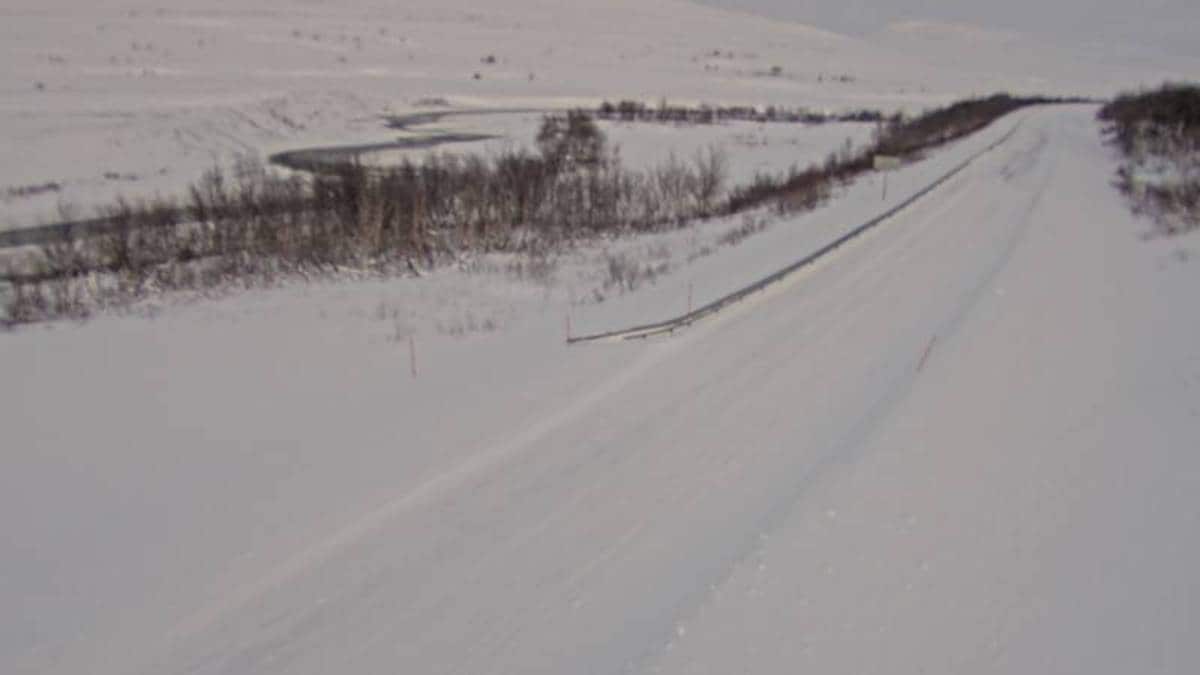 Bilde fra E6 retning Skaidi i nærheten av Hammerfest i Finnmark lørdag morgen:</description>