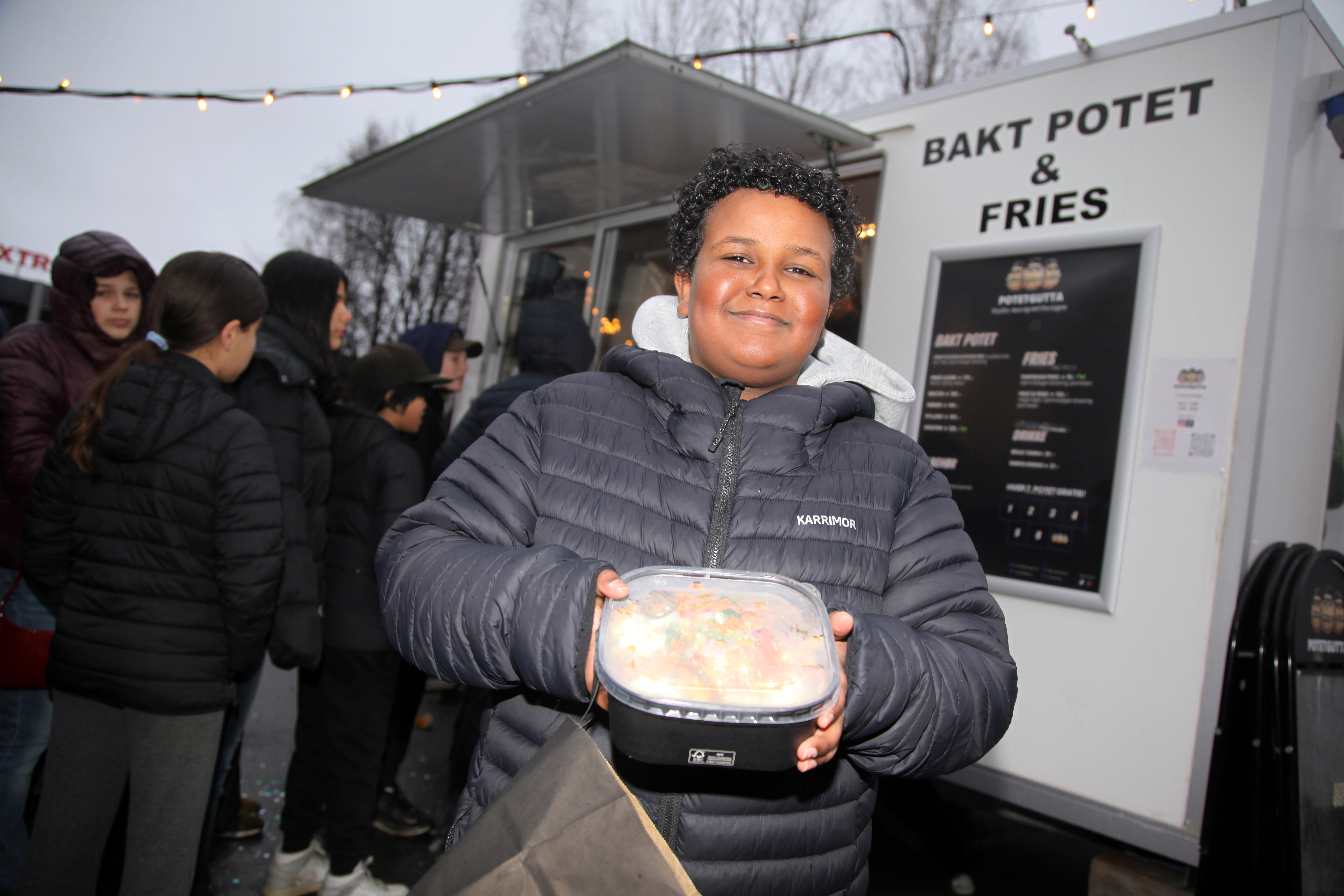 Han ble riktignok skjøvet bakover av noen større gutter, men endte likevel opp med en rykende varm porsjon bakt potet – toppet med takis og god saus.
