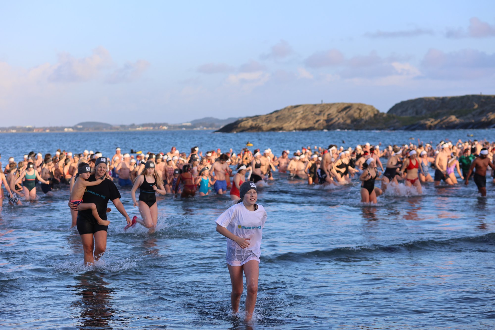 Sammen med mor og datter har hun nettopp kommet opp fra sjøen etter at tusenvis samlet seg lørdag pĂĽ Ălbergstranden for ĂĽ sette verdensrekord i isbading.