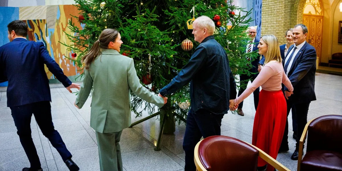 <media:description type="plain">Syv partier vil tvinge regjeringen til å berge Norske Skogs tilgang på klimakvoter. Her er Geir Pollestad (fra venstre), Oda Indgaard, Lars Haltbrekken, Hans Edvard Askjer, Sofie Marhaug, Aleksander Stokkebø, og Rikard Spets, mer eller mindre frivillig samlet rundt julegranen i Stortinget. Foto: Per Thrana</media:description>