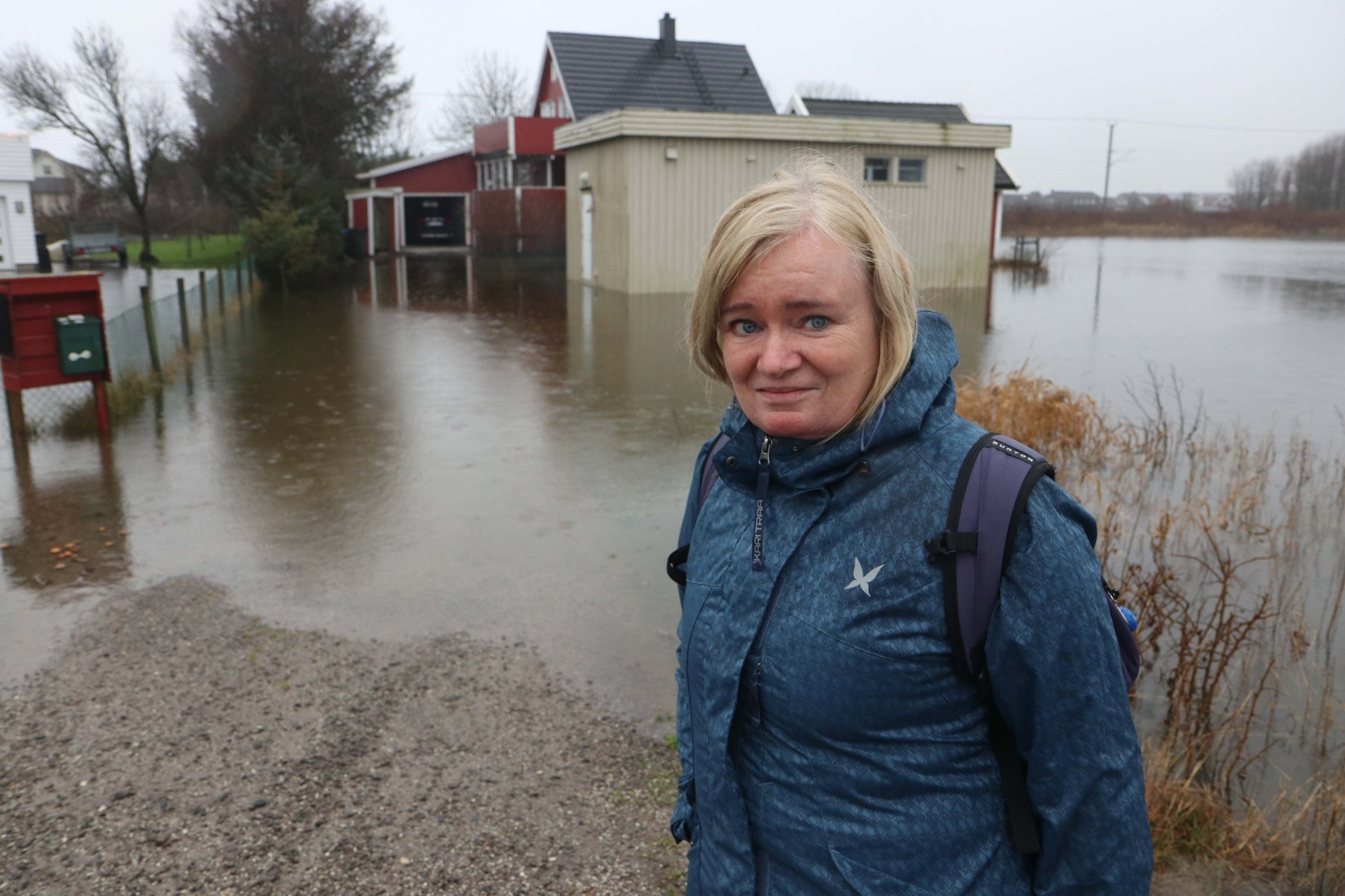 Bjårvatnet på Brusand gjekk fullstendig over sine breidder måndag. Elin Valle måtte ha bil-skyss for å koma dei siste metrane til huset.