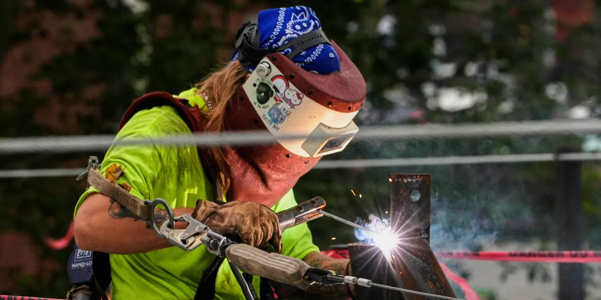 <media:description type="plain">En arbeider er i sving med sveising av stålkonstruksjoner til et boligprosjekt i Portland, Maine i USA. Foto: Robert F. Bukaty/AP/NTB</media:description>