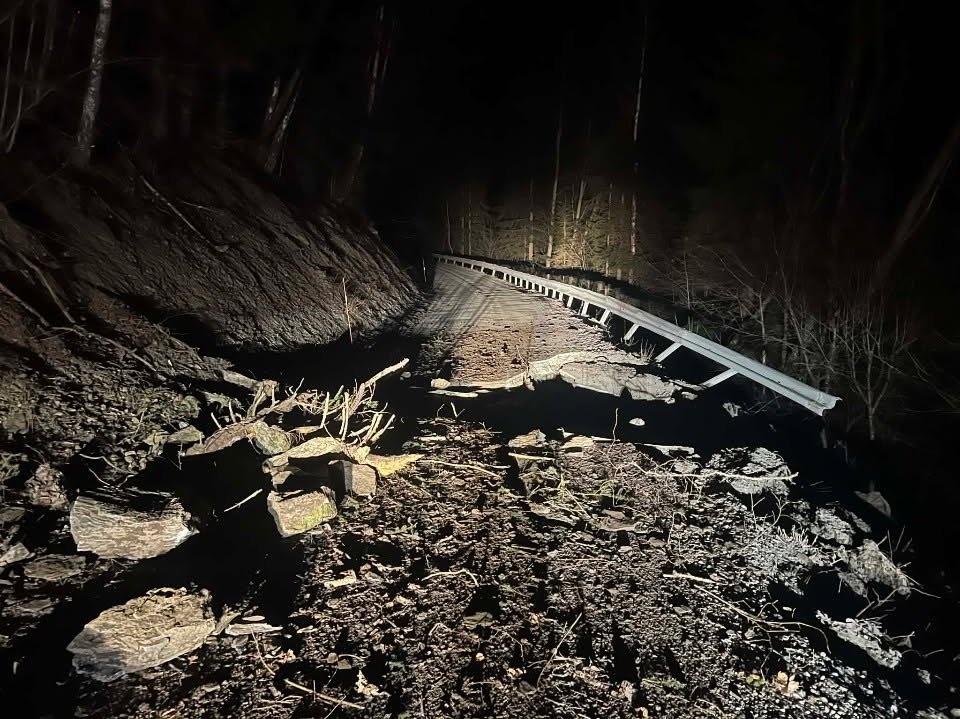 <span>Slik ser det ut på fylkesveg 2532 etter at et ras gikk natt til mandag.</span>