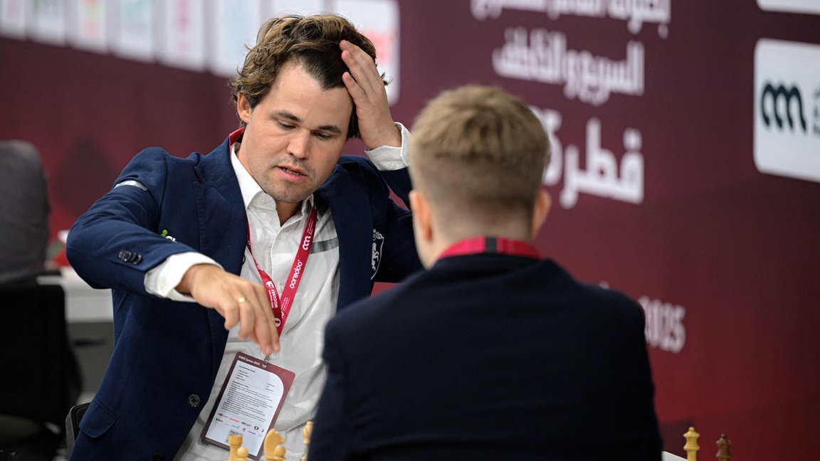 "title" : "Carlsen slo 14-Ärig sjakksensasjon - leder hurtigsjakk-VM",