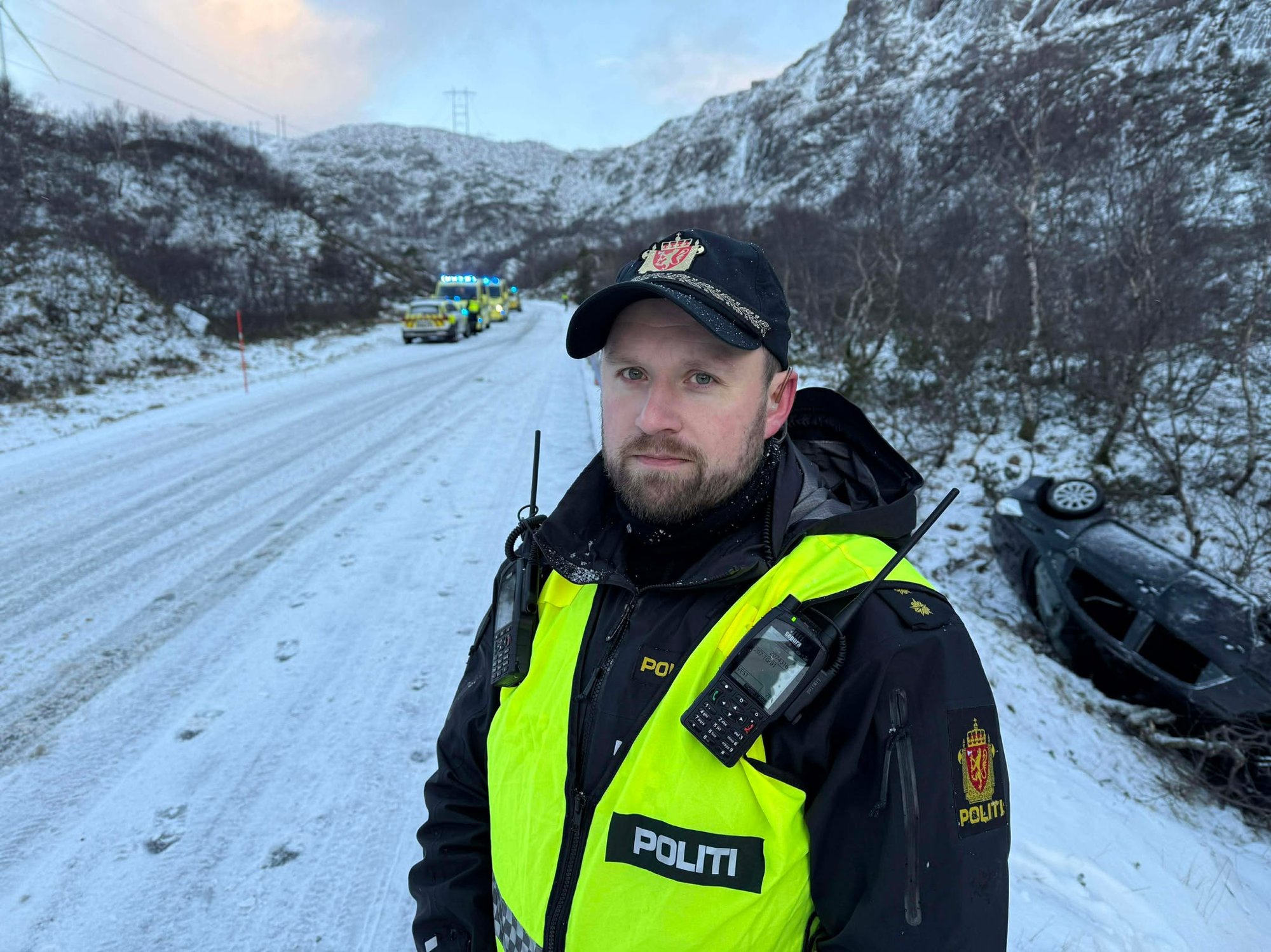 Bil hamna på taket, tre personar til legevakt: – Det er glatt på staden
