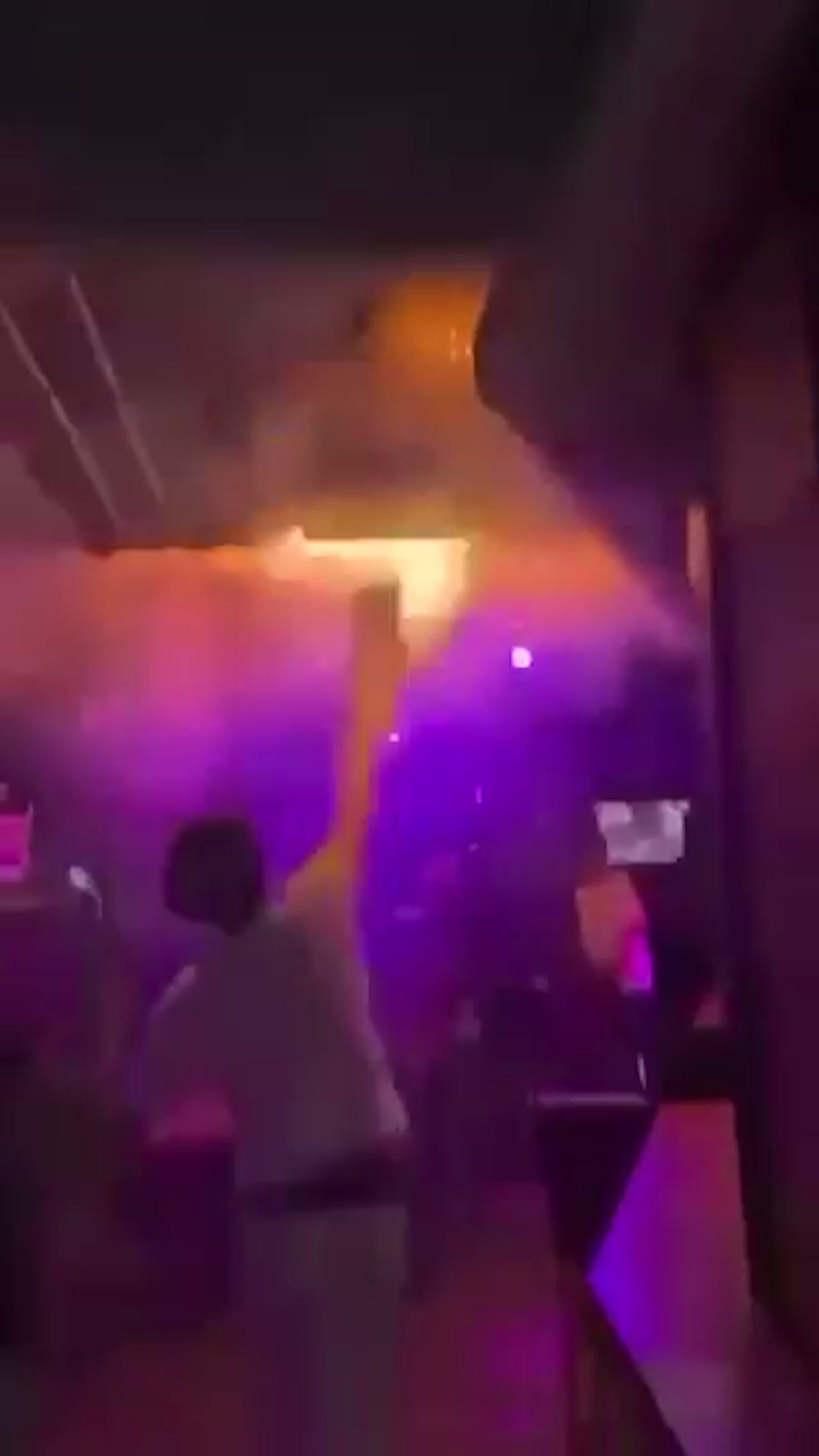 I én video ser man hvordan flammene plutselig slår ut i taket og sprer seg raskt mens unge festdeltagere i panikk løper mot trappen for å komme seg ut.