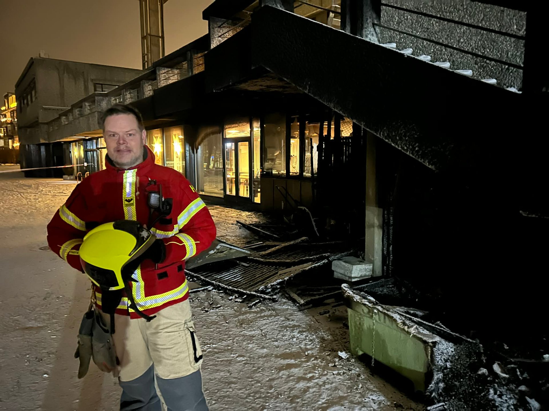 Da han gikk ut fant han en dør på nedsiden av bygget, som hadde blitt tent på. Det hadde brent gjennom døren, og dermed kom det mye røyk inn i bygningen. Det er betong i både veggene i første etasje og i etasjeskillet, dermed spredde ikke brannen seg videre.