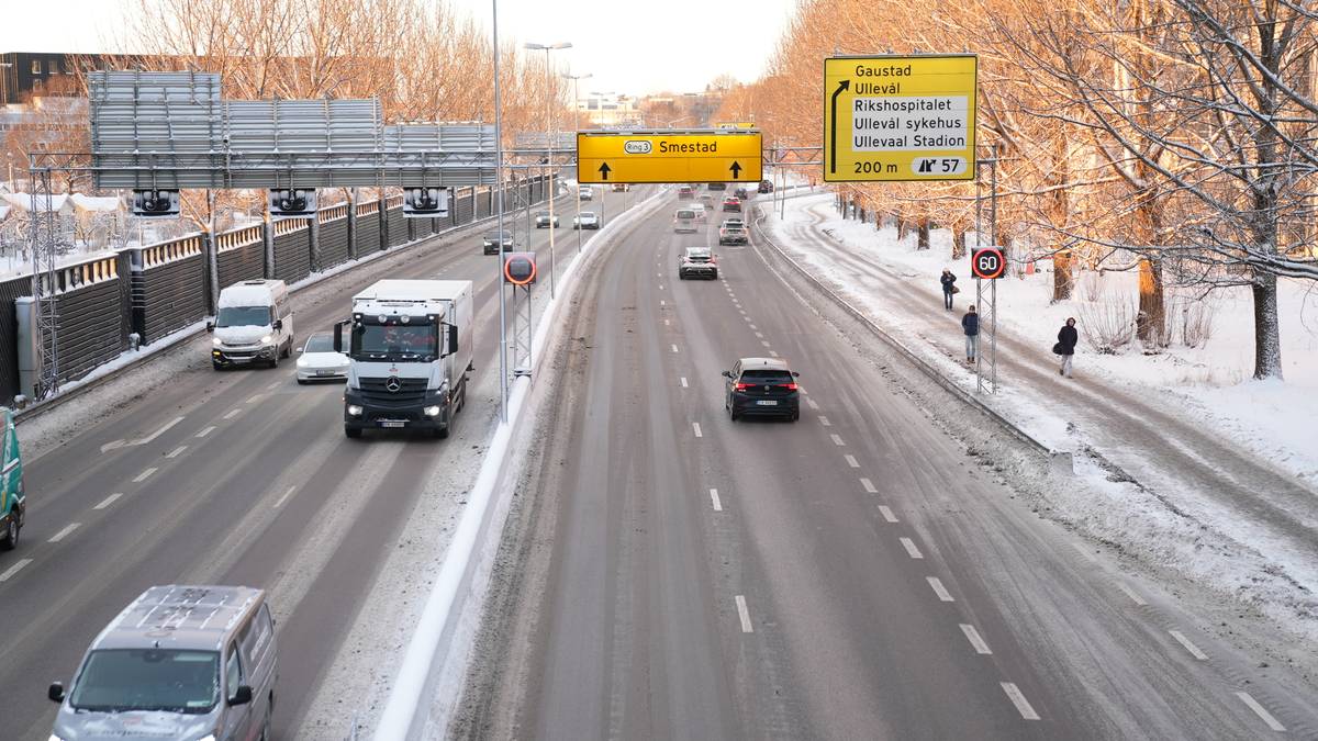 <media:title>Bilde av en vei delvis dekket av snø, med flere biler og en lastebil som kjører. I bakgrunnen er det veiskilt som viser retning til Gaustad og Ullevål, samt en hastighetsgrense på 60 km/t. To personer går på fortauet til høyre, omgitt av bartrær uten blader. Morgenlyset gir en gylden glød til omgivelsene. (Bildebeskrivelsen er laget av en KI-tjeneste)</media:title>