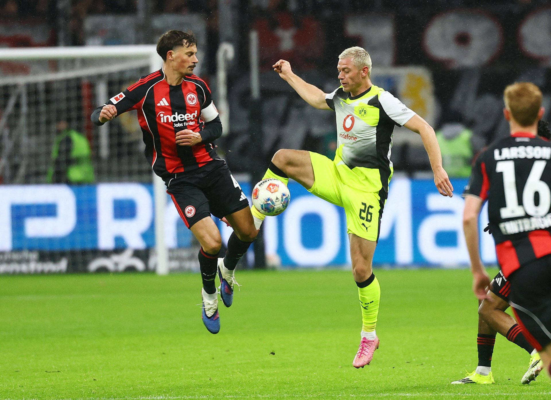 Dortmund ledet to ganger, men måtte til sist si seg tilfreds med at det ble poeng etter at Mahmoud Dahoud satte inn 3-2 for hjemmelaget to minutter på overtid. Carney Chukwuemeka sto for kampens sjette og siste mål. Julian Ryerson spilte hele kampen for gjestene og var ofte involvert offensivt på høyrekanten. Han sto for innlegget da Maximilian Beier ga gjestene ledelsen i det 10. minutt. Can Uzun utlignet på straffespark midtveis i den første omgangen. Kampen tok virkelig fyr først etter halvspilt andreomgang. Da skjøt Felix Nmecha inn 1-2-målet for Dortmund. Ledelsen varte bare tre minutter før Younes Ebnoutalib utlignet for Frankfurt. Nico Schlotterbeck hadde en avslutning i tverrliggeren for Dortmund i det 90. minutt, men to minutter senere så hjemmelaget ut til å avgjøre da Dahoud utnyttet en dårlig klarering av Ryerson og skjøt i mål via Emre Can. Rett før sluttsignalet gikk et innlegg fra Marcel Sabitzer forbi Karim Adeyemi, men bak ham dukket innbytter Chukwuemeka opp og satte inn 3-3-målet. Dortmund er tabelltoer åtte poeng bak Bayern München, som søndag kan øke til tosifret ledelse med seier over Wolfsburg.