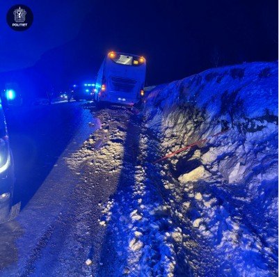 - 6 personer involvert i ulykken. Helsepersonell er på stedet og får oversikt over skadeomfanget. Ingen skal være alvorlig skadet. En person er sendt på sykehuset for videre undersøkelser. De andre sjekkes av helsepersonell. Bussen står delvis i grøfta og på alle fire hjul. Det er svært mye vind i området, melder politiet.