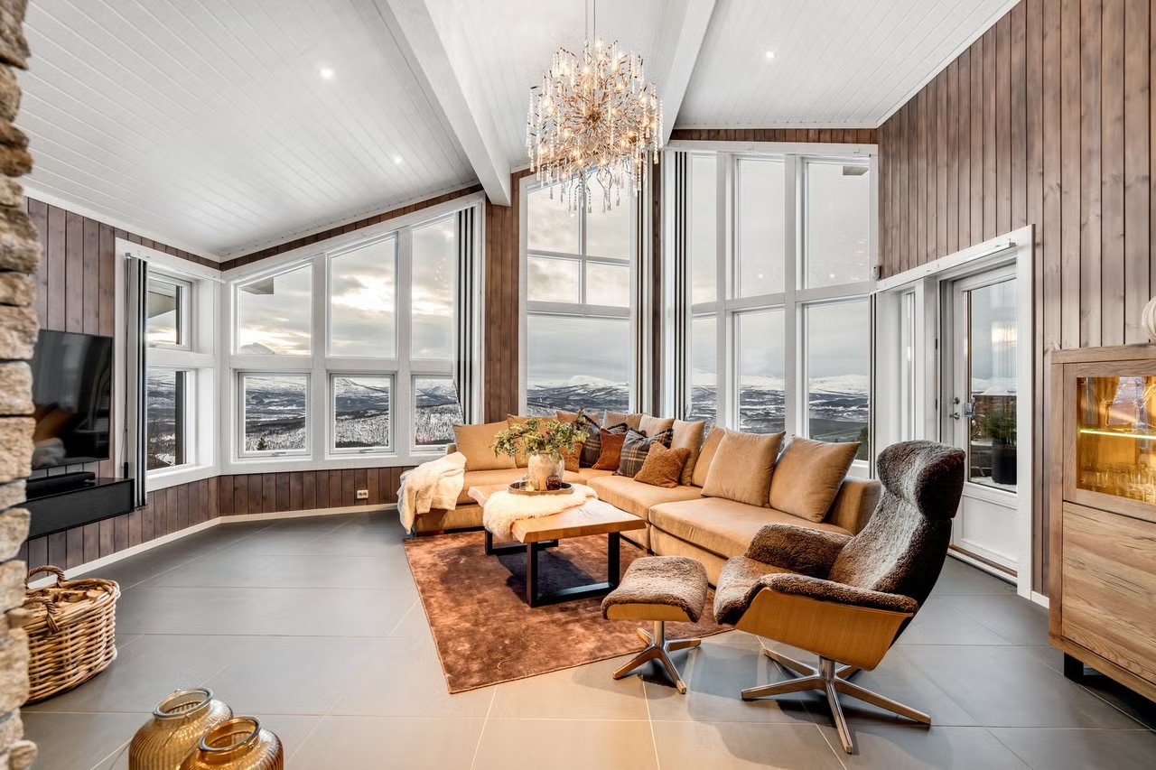Innvendig holder hytta ifølge annonsen en gjennomgående høy standard, med påkostede materialvalg på kjøkken, bad og øvrige rom.