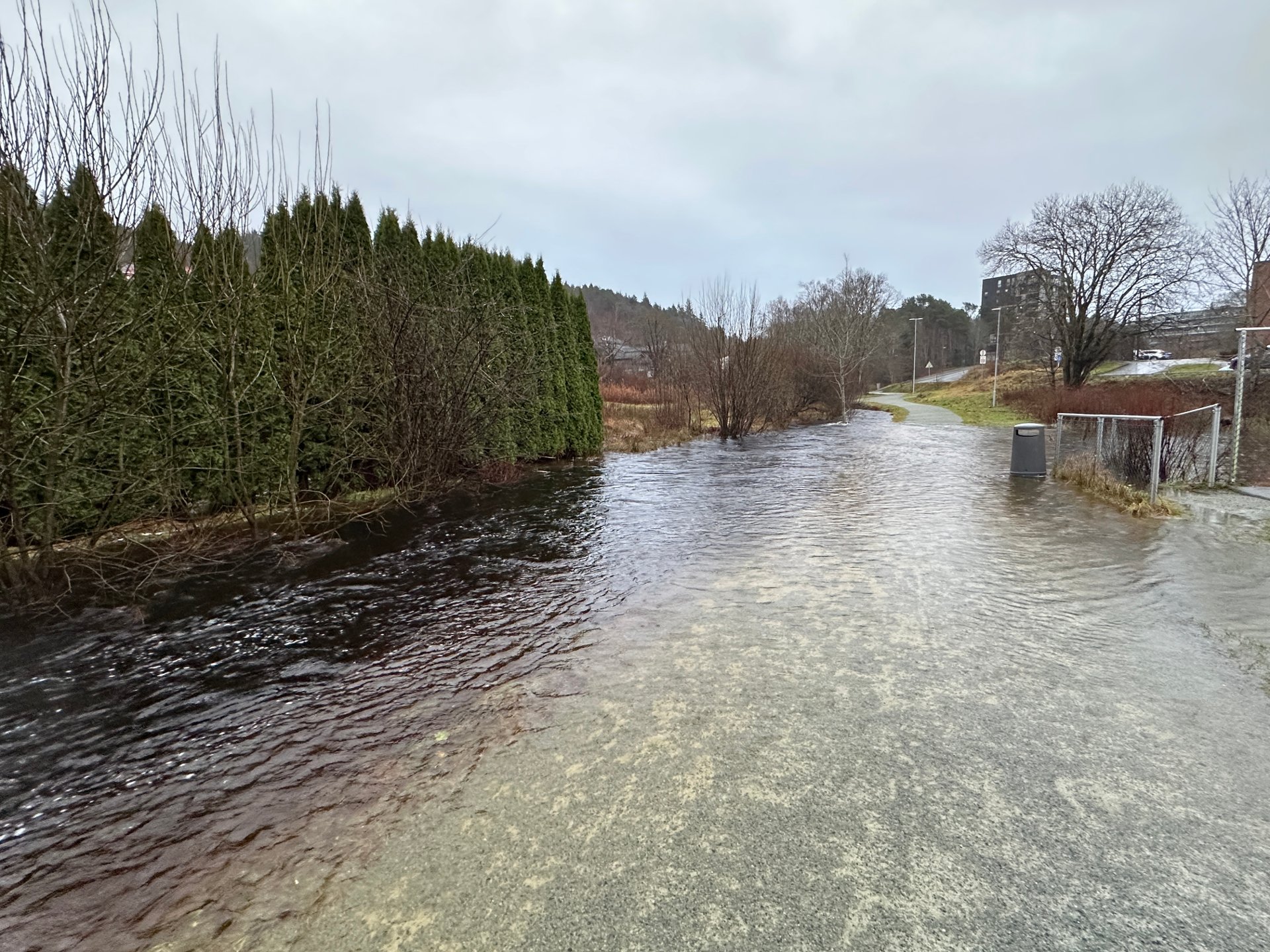 Gangstien i Ramsdalen fÄr kjÞrt seg av vannmassene. For turgÄerne ble mandagsturen ekstra lang.