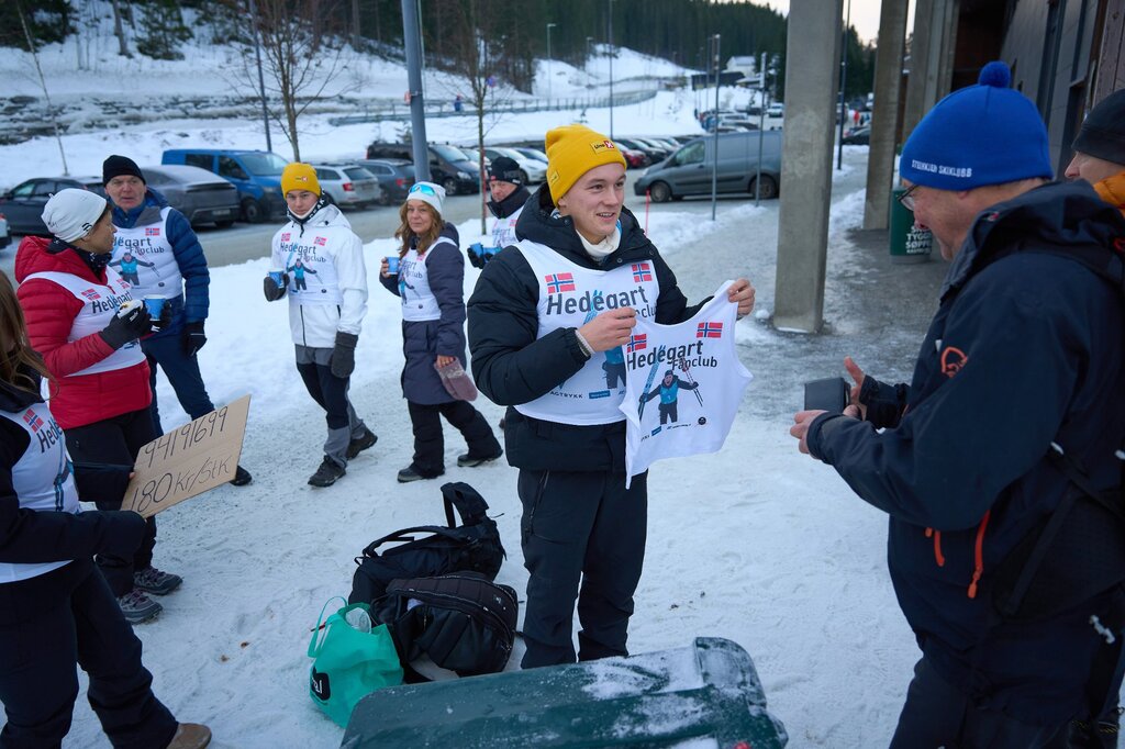 Kompisen Marius Møller har lagt ut en god månedslønn for at det skulle bli nok vester til Einar Hedegarts supportere. Nå selges det effekter på høygir.