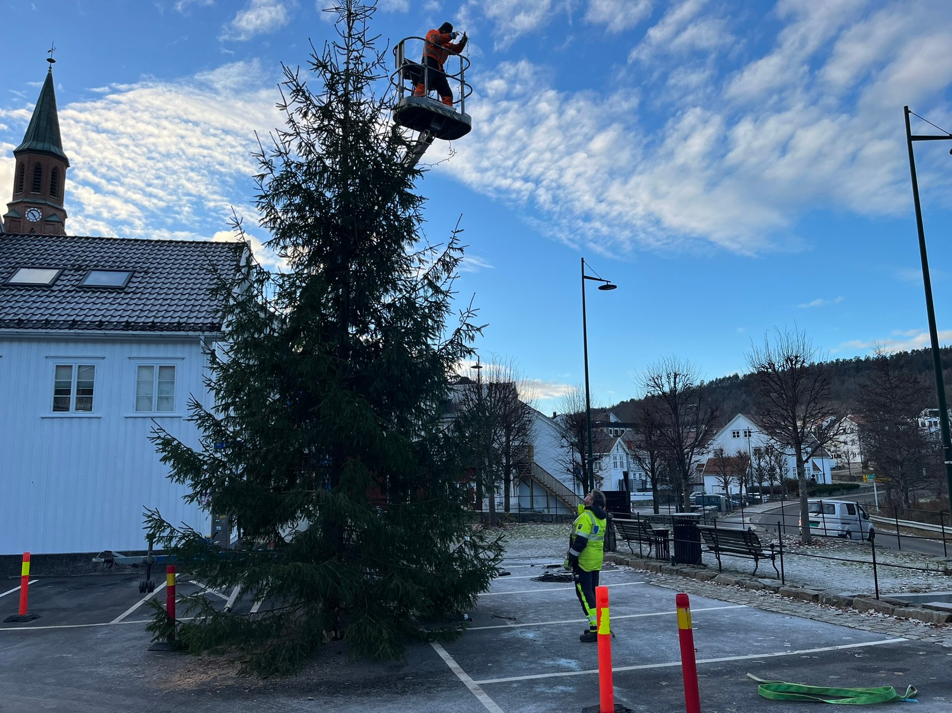 Nok et sikkert tegn pÄ at jula nÊrmer seg med stormskritt: Den store julegrana i sentrum er heist pÄ plass.