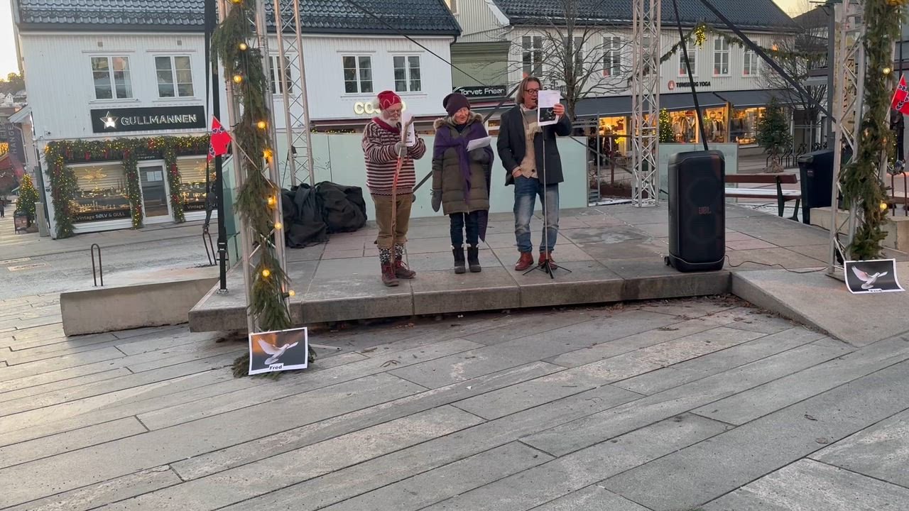 29. des 19:45 Med humor, allsang og alvor stilte Svein Østvik, bedre kjent som Charter-Svein, på scenen under en fredsmarkering på Torvet. Reality-profilen snakket om krig, våpenstøtte, barnevern og... (TB 398b)