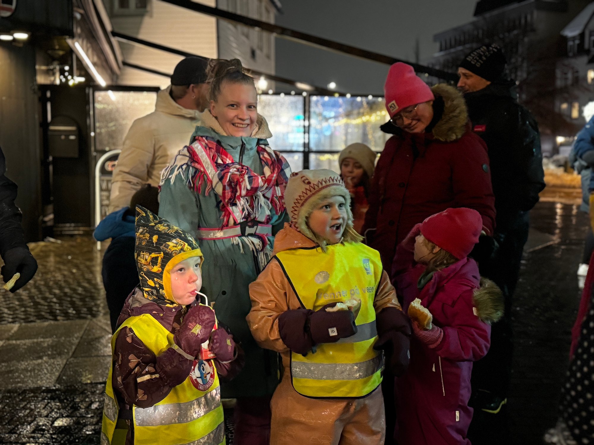 27. nov 19:18 Torsdag klokken 18 strÞmmet folk til sentrum tross vind og guffent vÊr. Hit kom bÄde nissen og nissekona, mens iHarstad delte ut boller. (iHarstad)