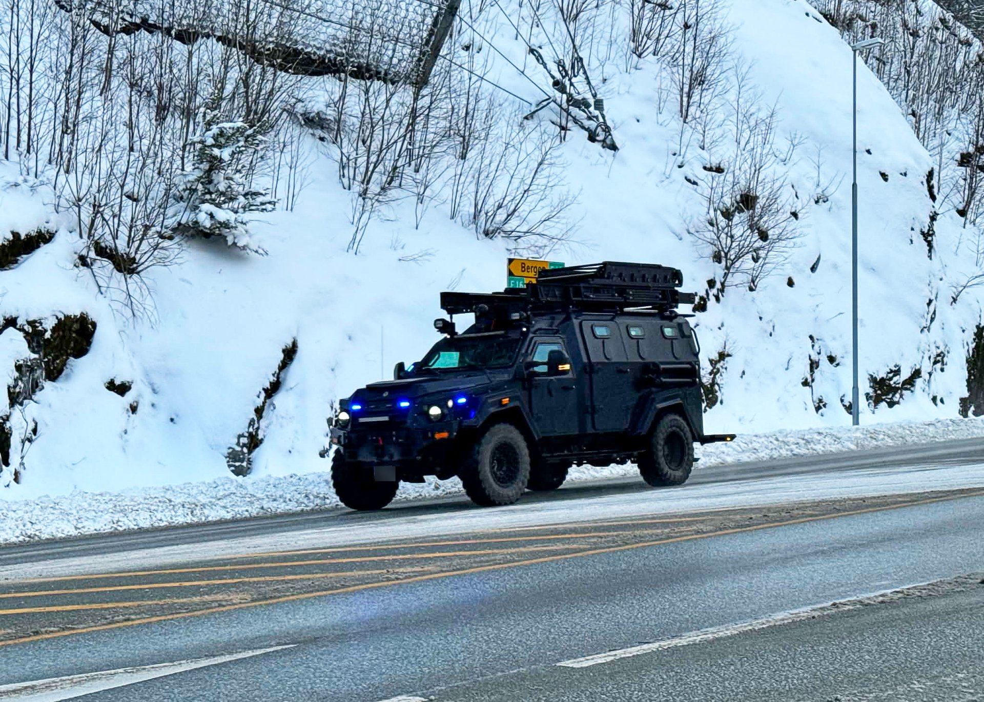 Politiets pansrede utrykningskjøretøy av typen Terradyne Gurkha er på vei til Bergen i forbindelse med skytingen i Hordvik.