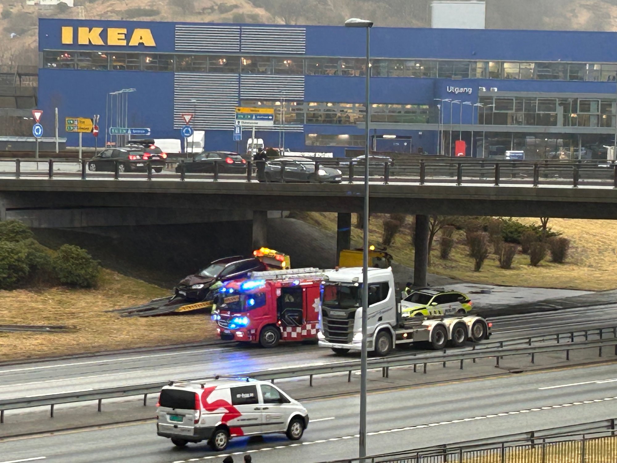 Like etter klokken 13 onsdag formiddag melder politiet om at en bil har kjørt av motorveien ved IKEA.
