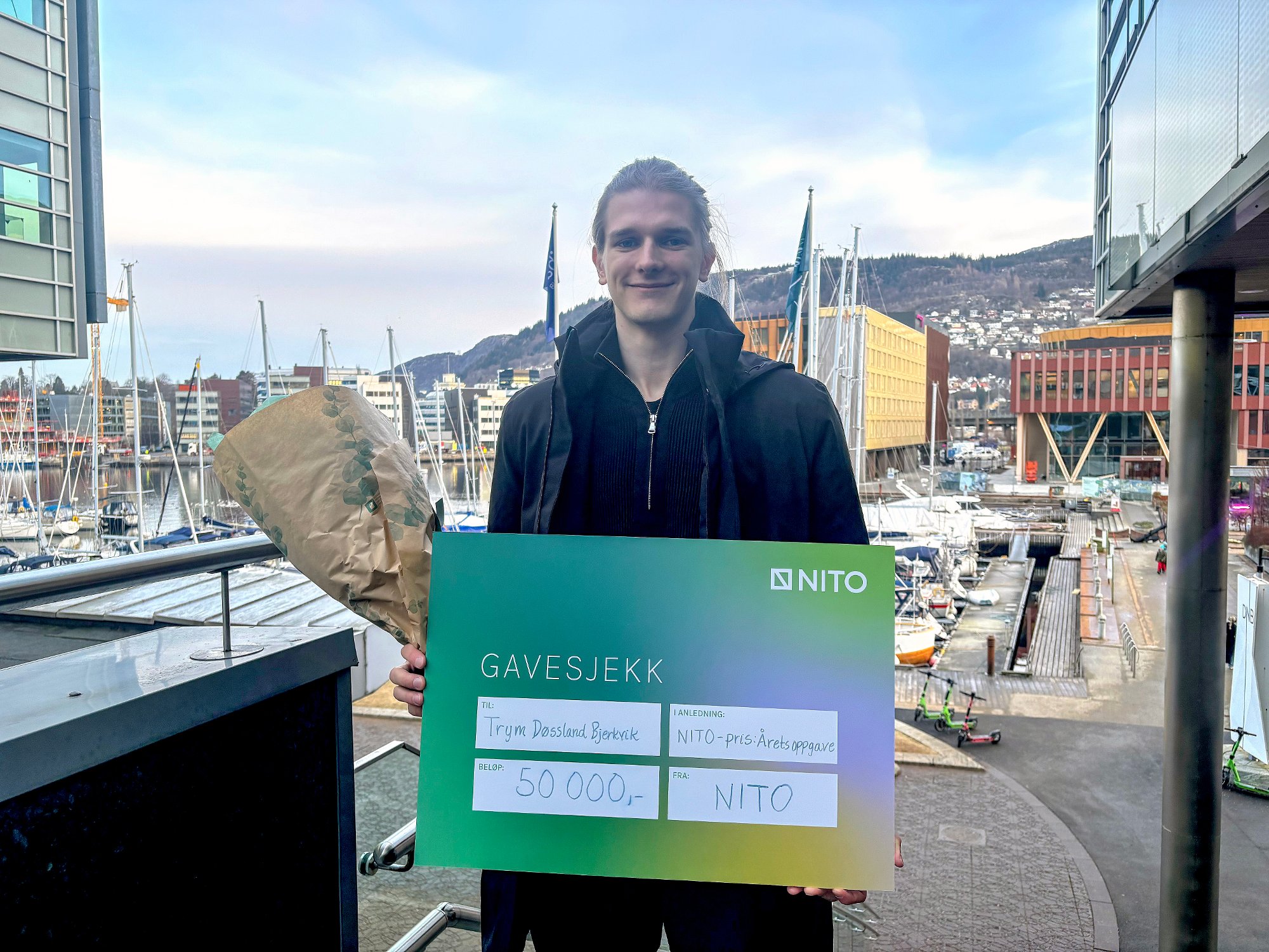 Trym Døssland Bjerkvik fra Åstveit er tildelt NITO-prisen «årets oppgave» og 50 000 kroner for sin masteroppgave i informatikk. Gjennom bruk av kunstig intelligens har han utviklet en modell som kan gi mer effektiv ruteplanlegging i hjemmetjenesten.