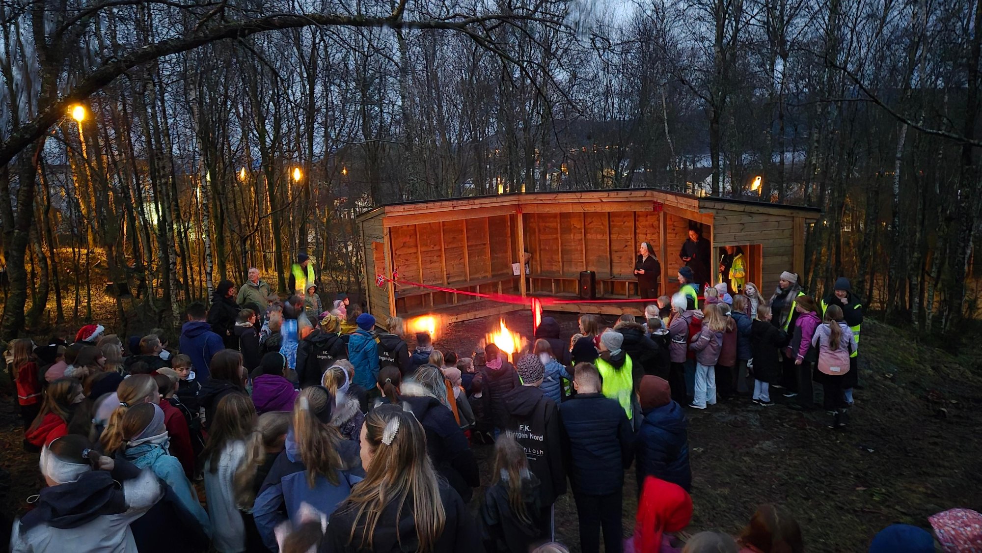 1. jan 15:30 250 elever og lærere ved Hordvik skole møtte opp da den nye gapahuken ble åpnet. (Åsane Tidende 217b)