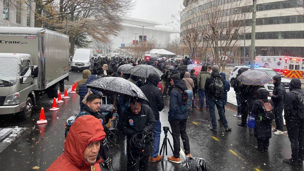 Kennedy Center i den amerikanske hovedstaden er arena nĂ„r Norge fredag er med i en VM-trekning for fĂžrste gang pĂ„ 28 Ă„r. NRK er til stede i Washington, der snĂžen har begynt Ă„ lave ned i den amerikanske hovedstaden. Utenfor trekningslokalet har det nĂ„ oppstĂ„tt kĂžkaos. NRKs reporter Halvor Ekeland stĂ„r i kĂžen, som han beskriver som rundt 200 meter lang â og voksende. â Den er blitt 30 meter lenger bare i lĂžpet av de ti minuttene jeg har vĂŠrt her, sier Ekeland. USAs president Donald Trump er blant mange celebre gjester til kveldens trekning. NRKs reporter forteller om enormt sikkerhetsoppbud utenfor Kennedy Center. â Alle mĂ„ gjennom full flyplass-sikkerhet. Jeg har ikke bevegd meg en meter de siste fem minuttene. Alle mediene ble bedt om Ă„ komme tidlig i dag, og det er lett Ă„ forstĂ„ nĂ„, sier Ekeland. NRKs reporter forteller nĂ„ om en spent stemning blant dem som stĂ„r i kĂž. â Vi har fĂ„tt beskjed om at alle mĂ„ vĂŠre inne 10.30 (Ăžstamerikansk tid) av sikkerhetsmessige Ă„rsaker. Det er halvannen time til, men denne kĂžen gĂ„r sĂ„ sakte at det ikke er sikkert de som er bakerst slipper inn, melder Ekeland i 15-tiden norsk tid. Fortsatt er det god tid til selve trekningen, som starter 18.00 norsk tid. NRK starter sendingen 17.30.