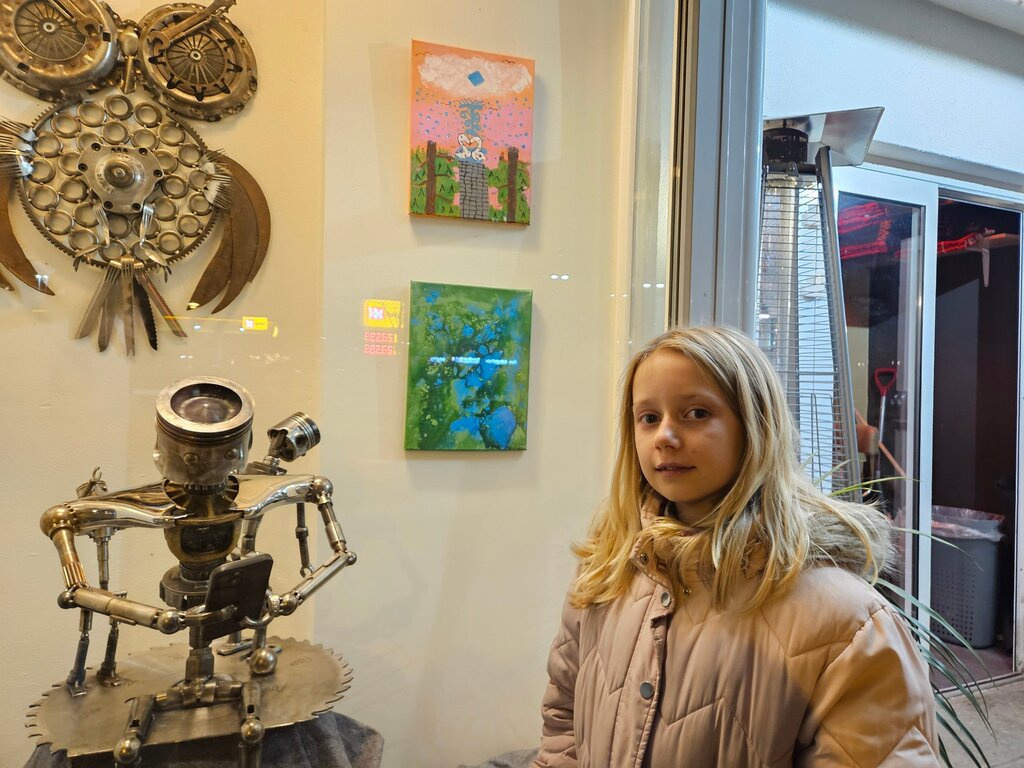 Det er ei ekte familiær utstilling ein kan skode i montrane til Øra Kafé i desember månad. Emma Kolmann Bråten (10) stiller ut eigen kunst saman med mamma Lilly Kolmann og pappa Emil Bråten.