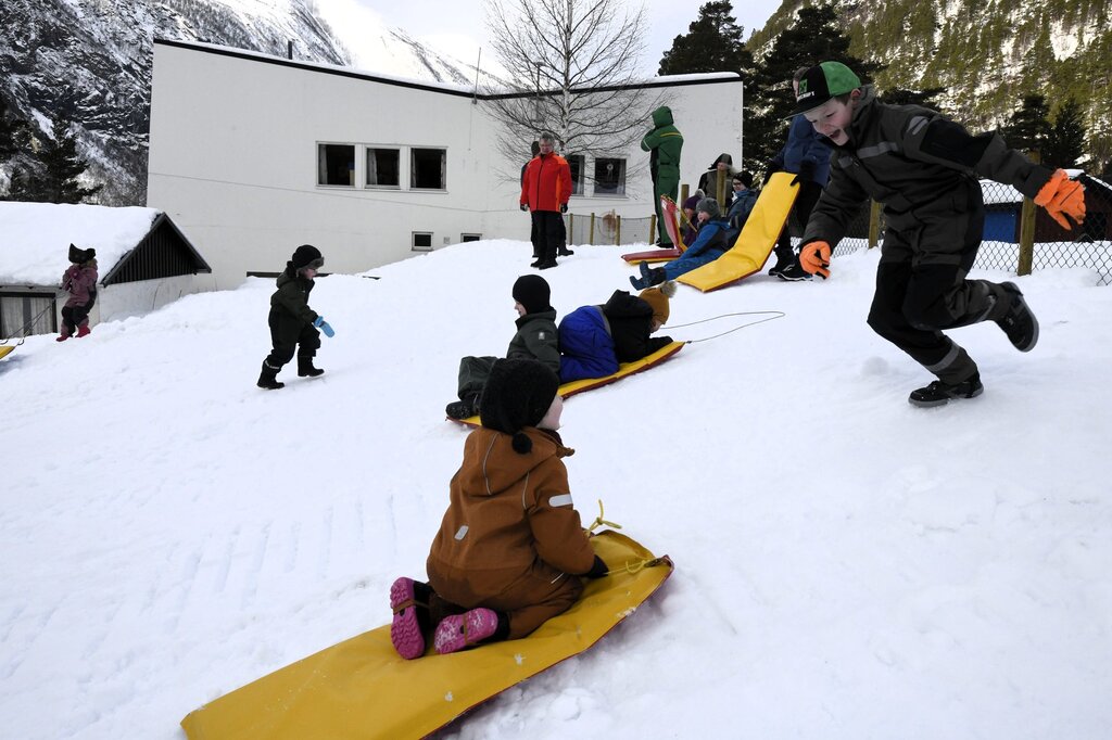8. des 9:55 – Det er en stor dag, sier styrer Magne Bjorli, der han står i porten og tar imot noen av barna på den aller første dagen for nye Skjøllend barnehage. (Aura Avis 315b)