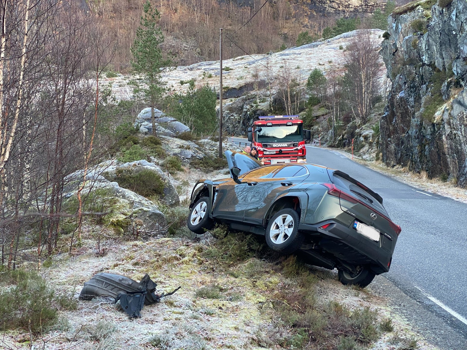 Tidleg ettermiddag mÄndag hamna ein personbil av Austfjordvegen i Alver pÄ det glatte fÞret.