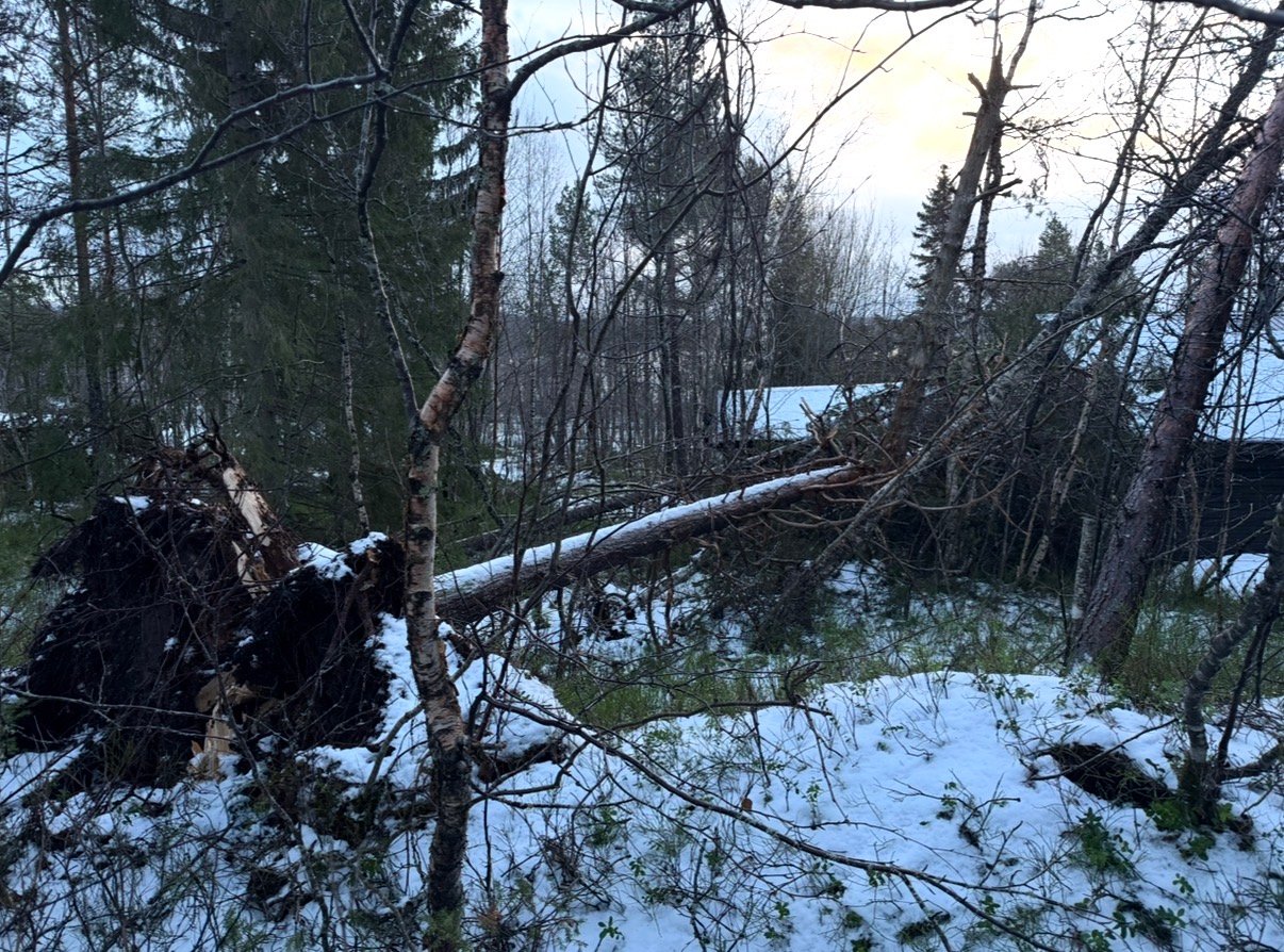 Flere store trĂŚr veltet over et privat hyttetak etter at stormen herjet i Nordland i helgen.