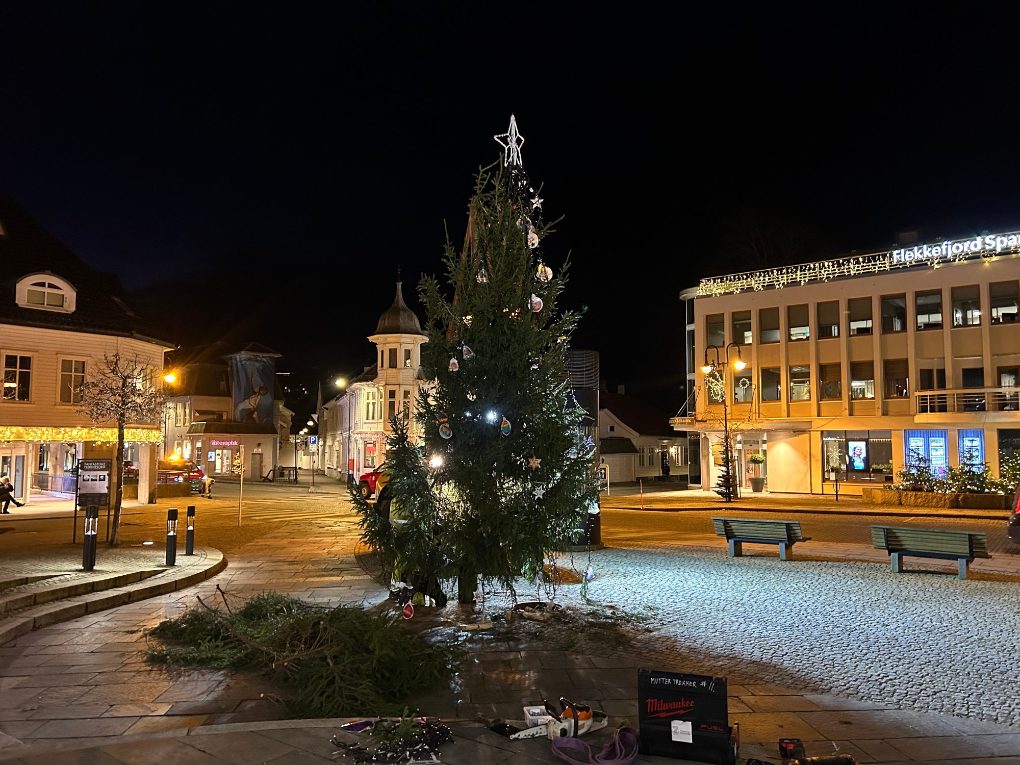 22. des 7:15 FĂ„ timer etter at det ble oppdaget at juletreet i Ăvre Park var skĂ„ret ned igjen, er det heist pĂ„ plass igjen. Riktignok blir treet lavere og lavere. (Avisen Agder 238b)