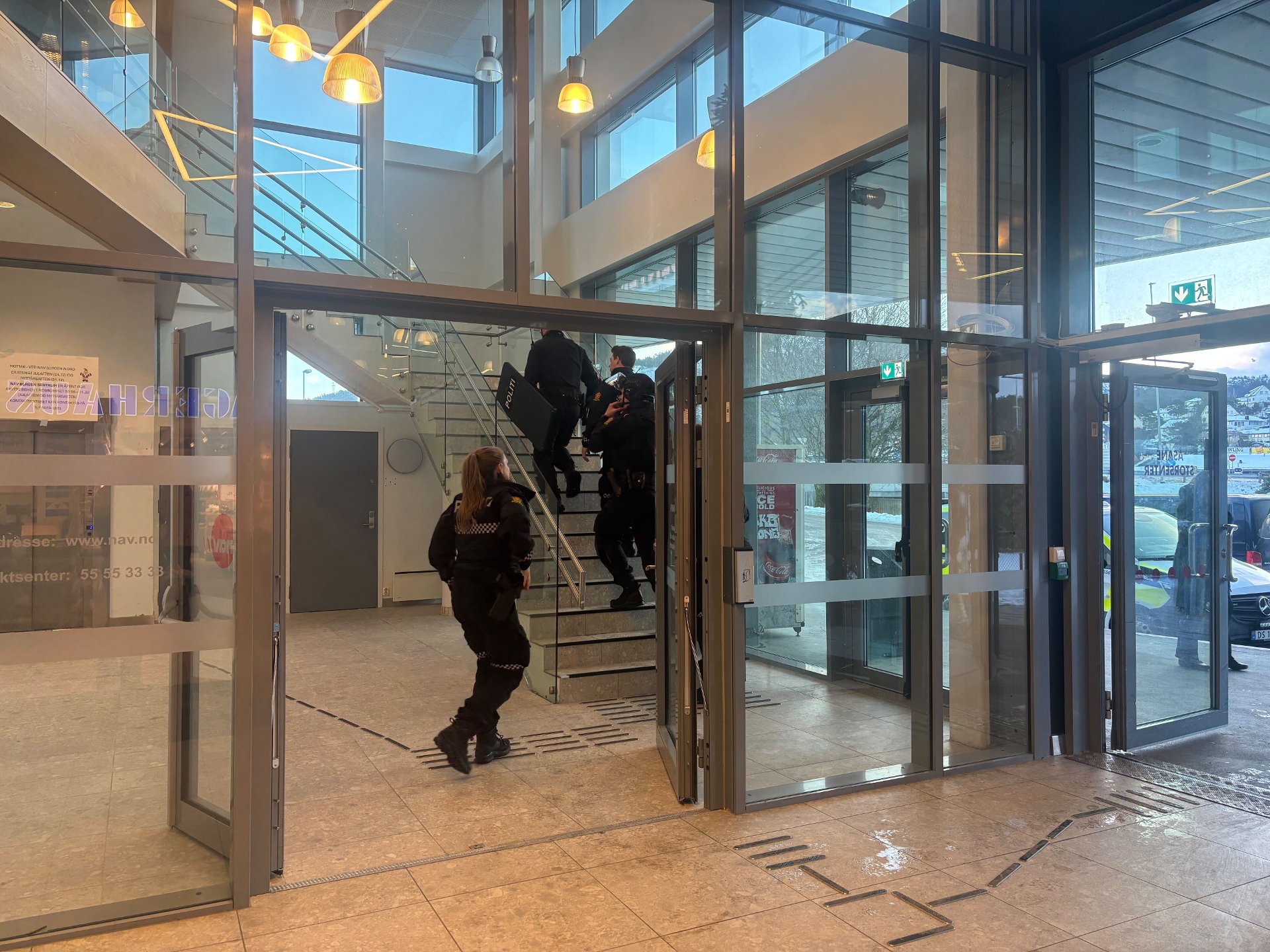 5. jan 12:33 En mann skal ha oppfÞrt seg truende. Politiet bar vÄpen da de aksjonerte mot Nav-lokalene mandag. (BA 2.2kb)