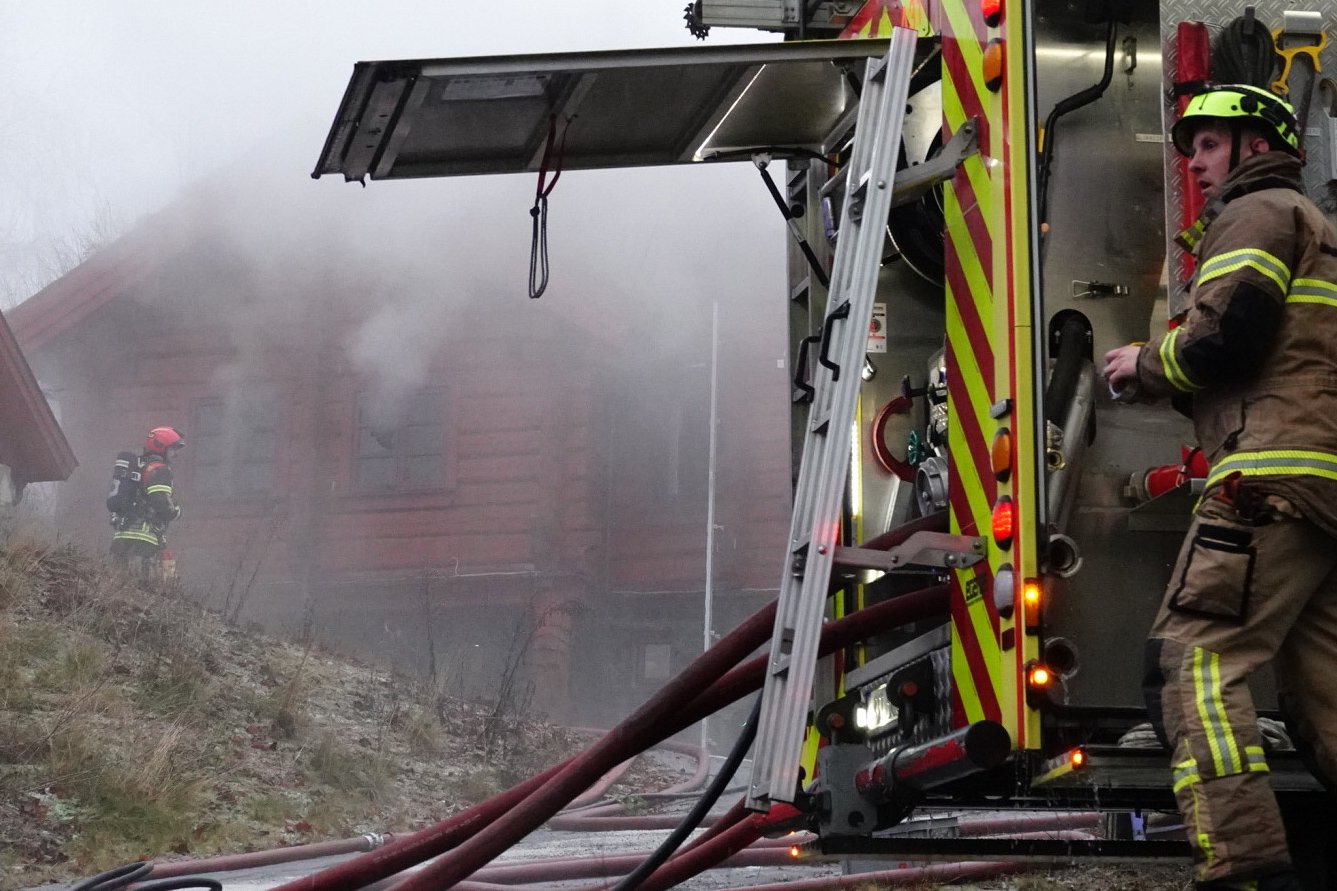 Det tok fyr i et tømmerhus på Skui torsdag.