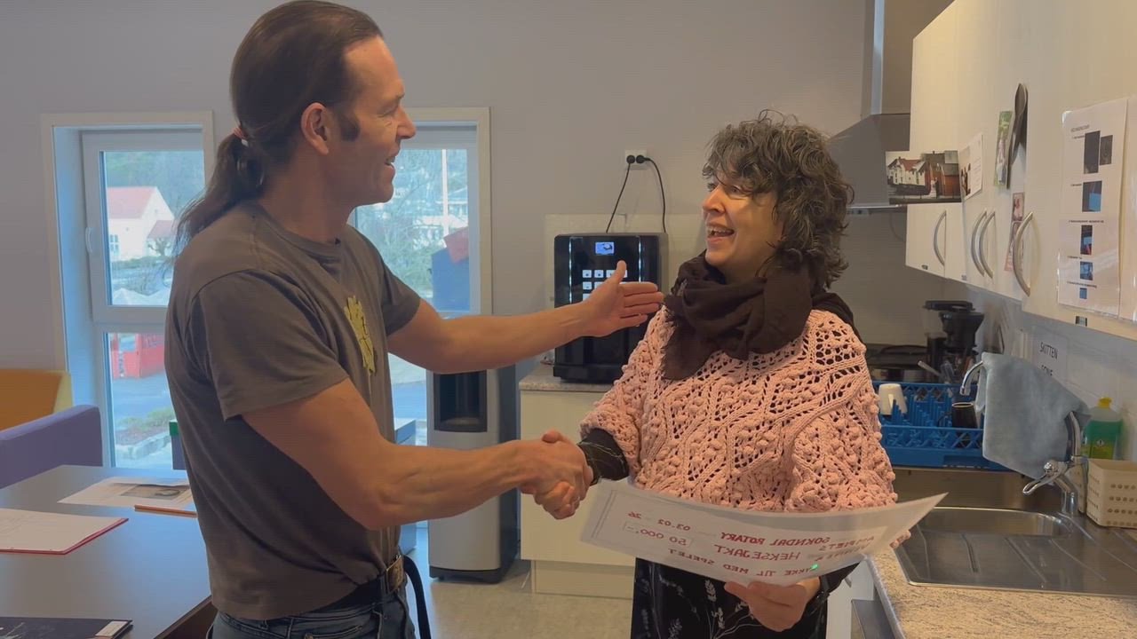 Anne Aarstad fra Amfiets Venner fikk en ordentlig overraskelse pÄ slutten av arbeidsdagen tirsdag. Edgar Thodal fra Sokndal Rotary kunne tildele en sjekk med pengestÞtte til Amfiets Venner og deres spel «Heksejakt», som Aarstad blant annet har vÊrt med pÄ Ä skrive.