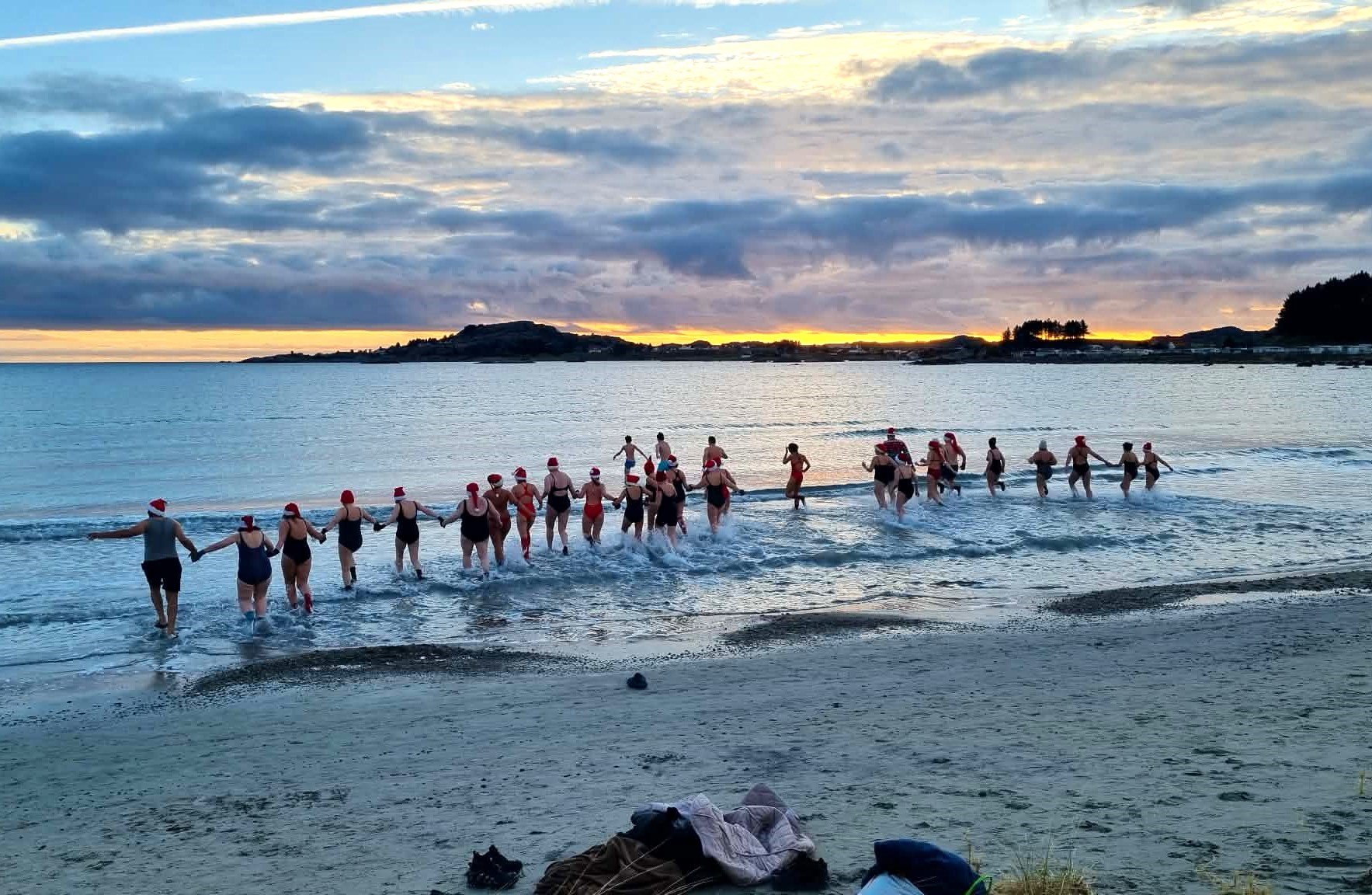 Nærmest vindstille og med en rosa himmel som bakteppe, samlet folk seg på Skadbergsanden for å markere vintersolverv med et isbad. Tradisjonen, startet i 2016, gir en følelse av samhold og forventning om lysere tider.
