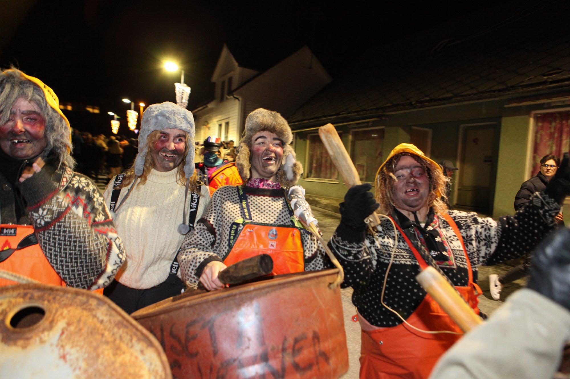 Klokka 20.00 toga Barnekjippen gjennom Strandgata. Det var eit elendig vêr, men det stoppa ikkje dei mest ivrige. Ein hyggeleg tradisjon som blei runda av med fellesfyrverkeri.
