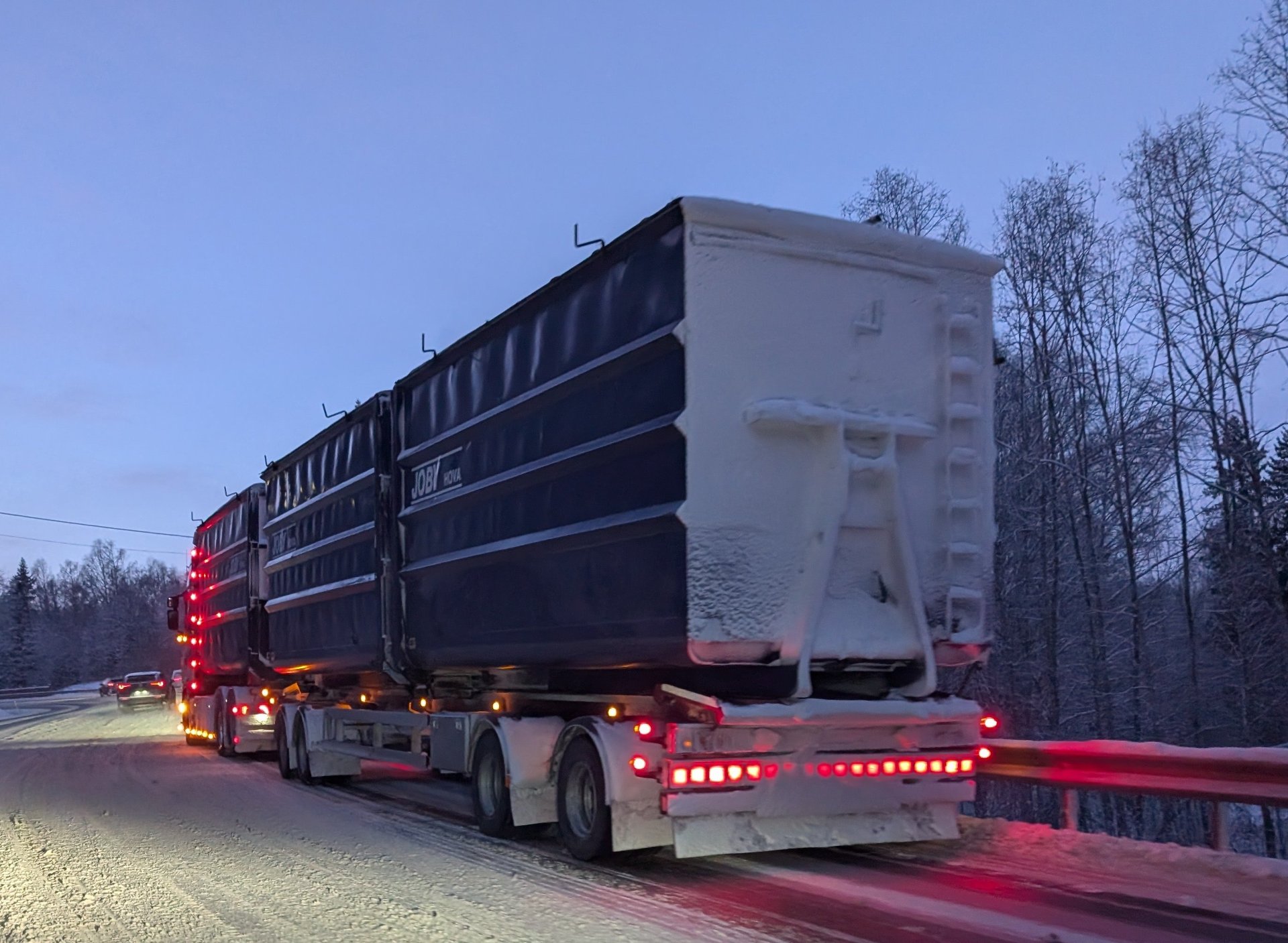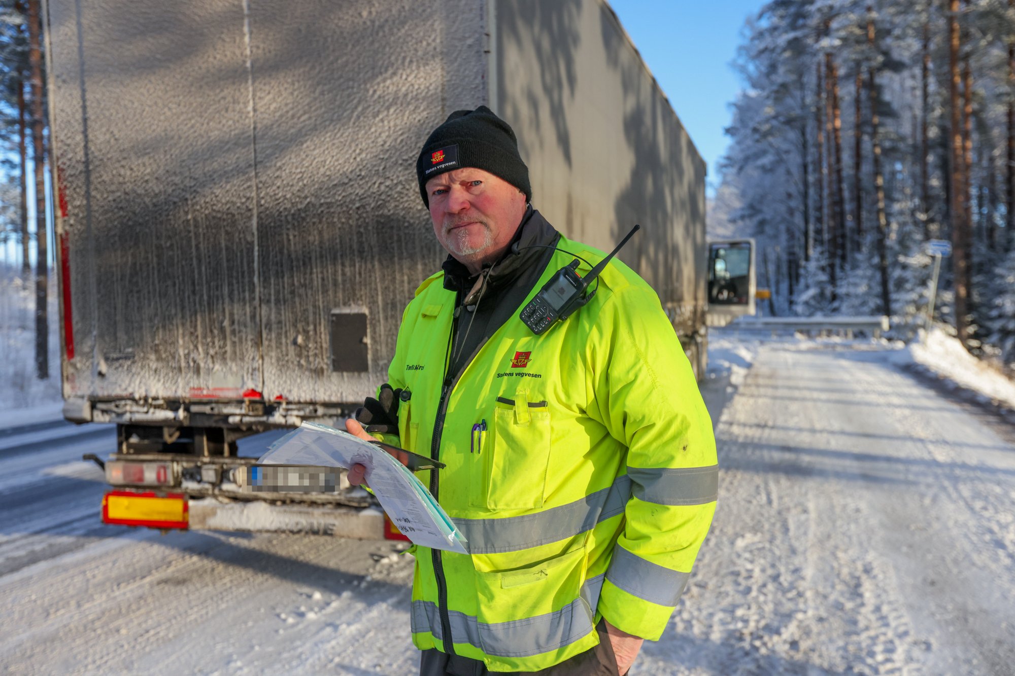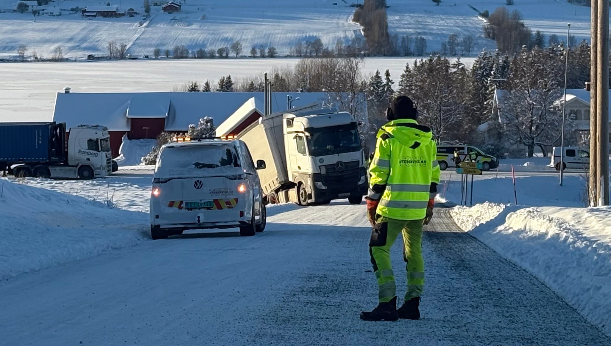 6. jan 11:58 Et vogntog stÄr midt i veien langs riksvei 4 sÞrgÄende fra GjÞvik. (Hadeland 181b)