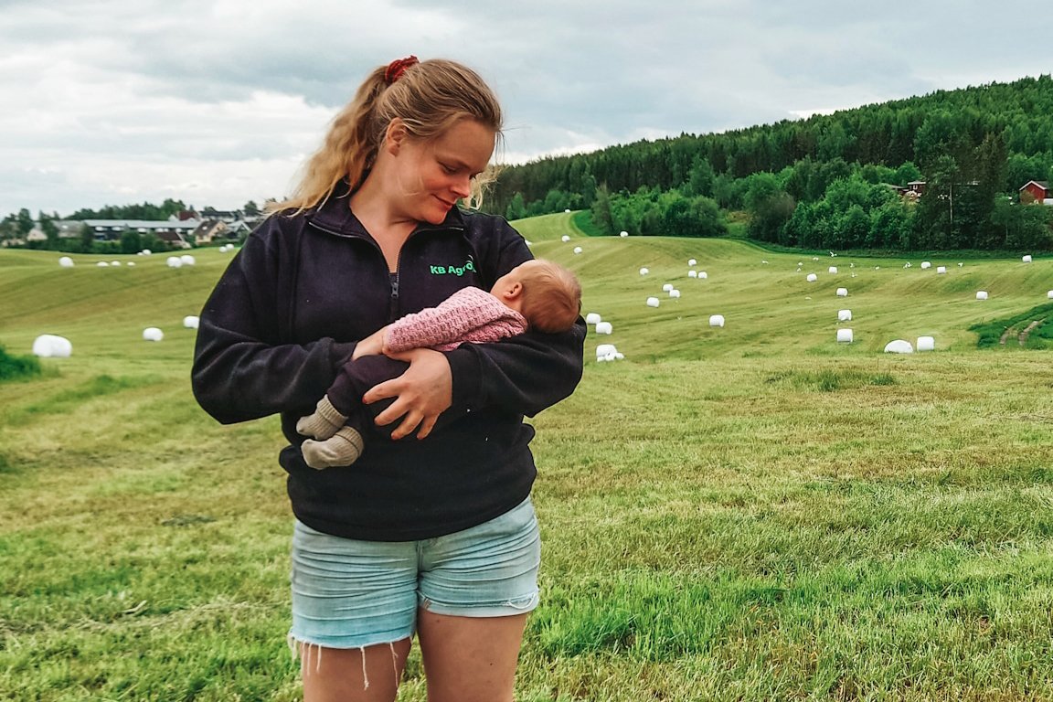 Nora Sandberg (34) fra Furnes har to barn. Den ene foreldrepermisjonen hadde hun fra en vanlig jobb, den andre mens hun var heltidsbonde. Kontrasten ble stor.