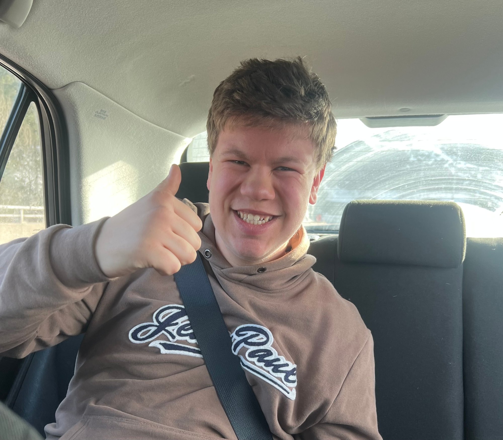 Fra baksetet i bilen deler Erik Damsgård Tomter (14) forventningene før premieren på «Team Pølsa». Kanskje blir det et stopp innom farmor og beste på Hamar på turen òg.