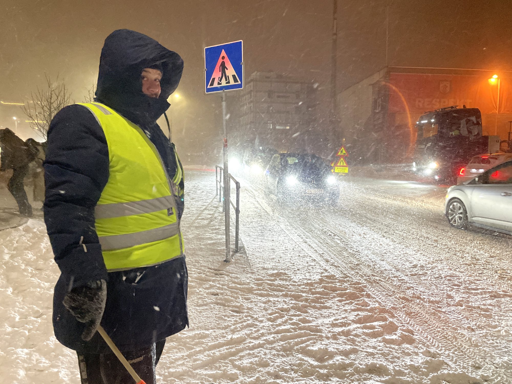 Christoffer Berg stod trafikkvakt for Bryne skule måndag morgon. Vakta kan oppsummerast med kraftige vindkast og snø i fjeset, så langt Jærbladets journalist kunne sjå.