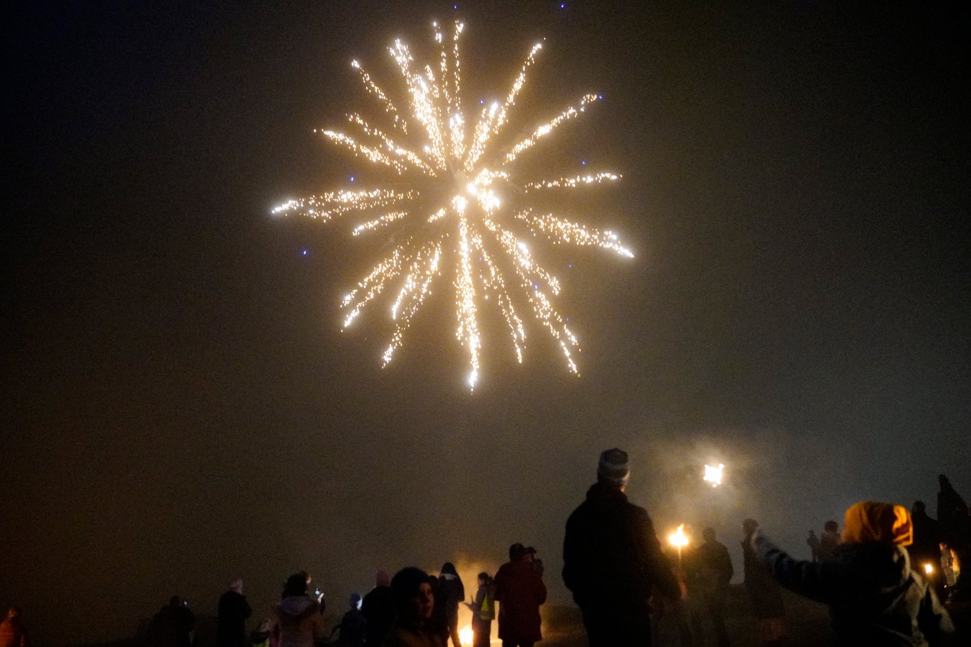31. des 18:26 Tradisjon tru blei nyttår markert med rakettoppskyting allereie klokka 18 på Kleppevarden. Mange møtte opp til fakkeltog og show på himmelen. (Jærbladet 239b)