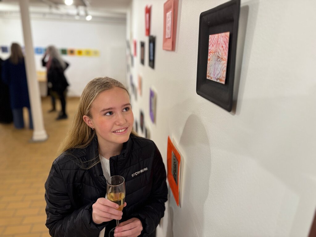 Fram til 19. desember mÄ elevenes kunstverk henge utstilt pÄ SÞgne gamle prestegÄrd. - Men sÄ skal jeg pakke det inn og gi det i julegave, sier Alba Gjermundsnes om sitt eget verk som hun er aldri sÄ lite stolt av.