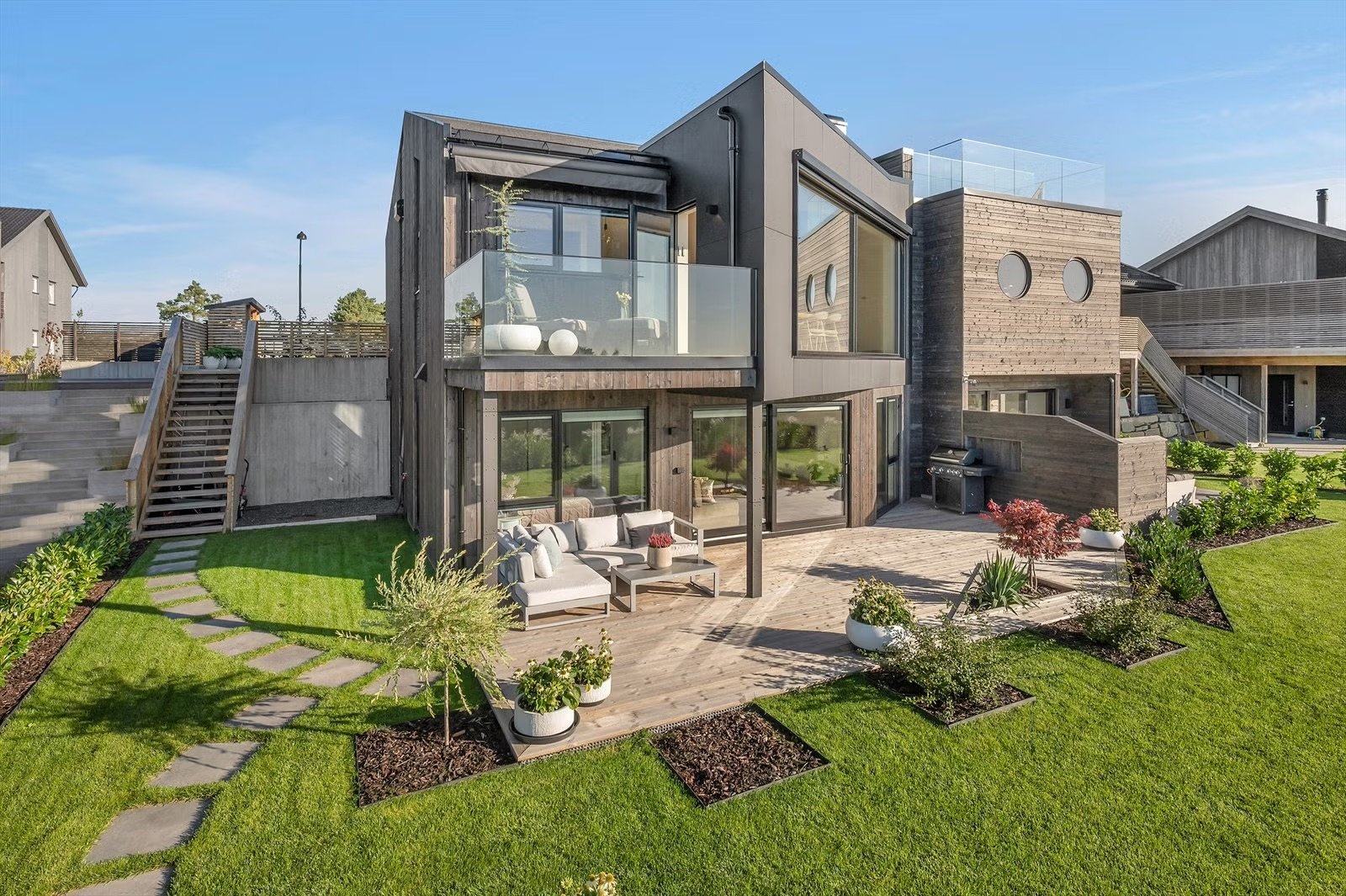 Huset ligger i et etablert boligfelt og skiller seg ut med gjennomfĂžrte lĂžsninger.