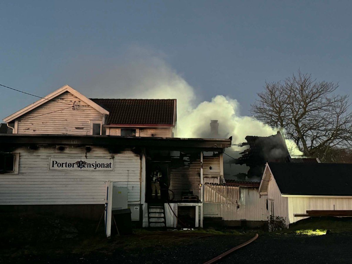 KRAGERØ: Natt til tirsdag begynte det å brenne hos Portør Pensjonat. Tirsdag morgen brenner det fremdeles.