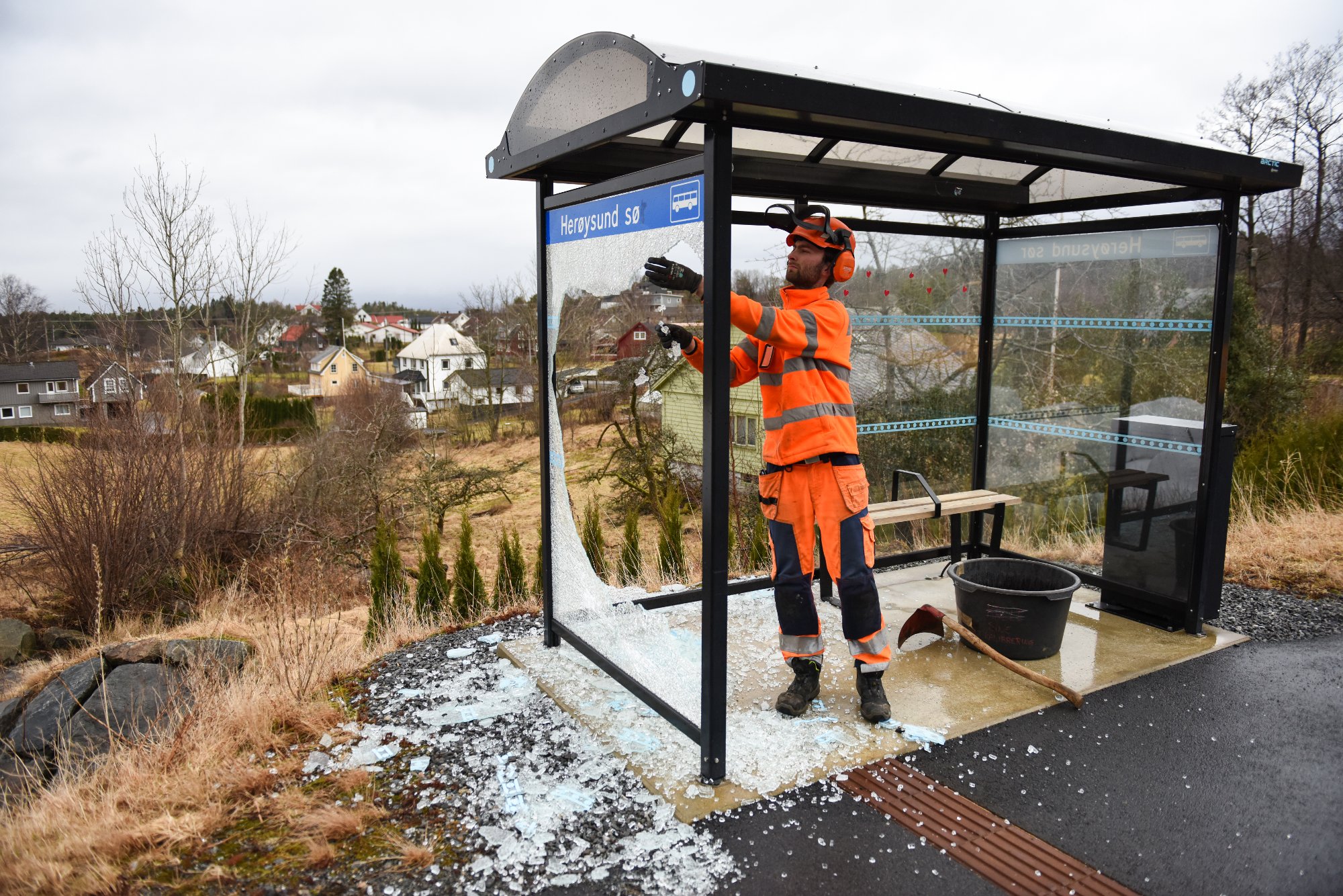 To av fire ruter er knuste på busskuret i sørgåande retning i Herøysund. Vestland fylkeskommune vurderer å politimelda forholdet.